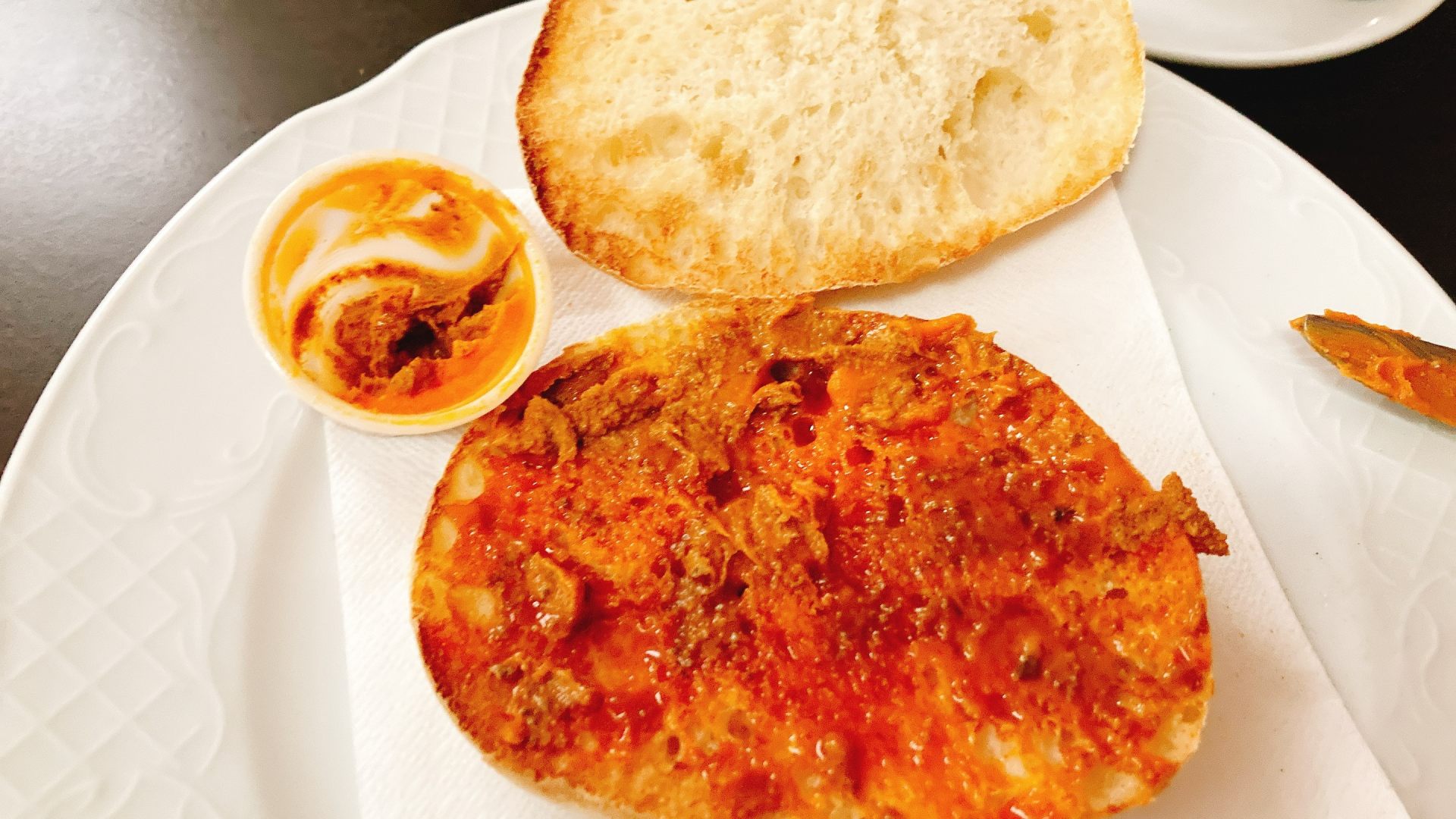 定番ではありませんが、いち押しなのはレッドバターパン(Molletes con manteca colorá)。牛や豚肉のパテと脂、またはベーコンオイルで作られたレッドバターを平たいパンに塗ったもので、スペインの家庭では週末に食べられるちょっと特別なメニューです。どの店にも置いてあるわけではないので、見つけたら注文してみるのをおすすめします。