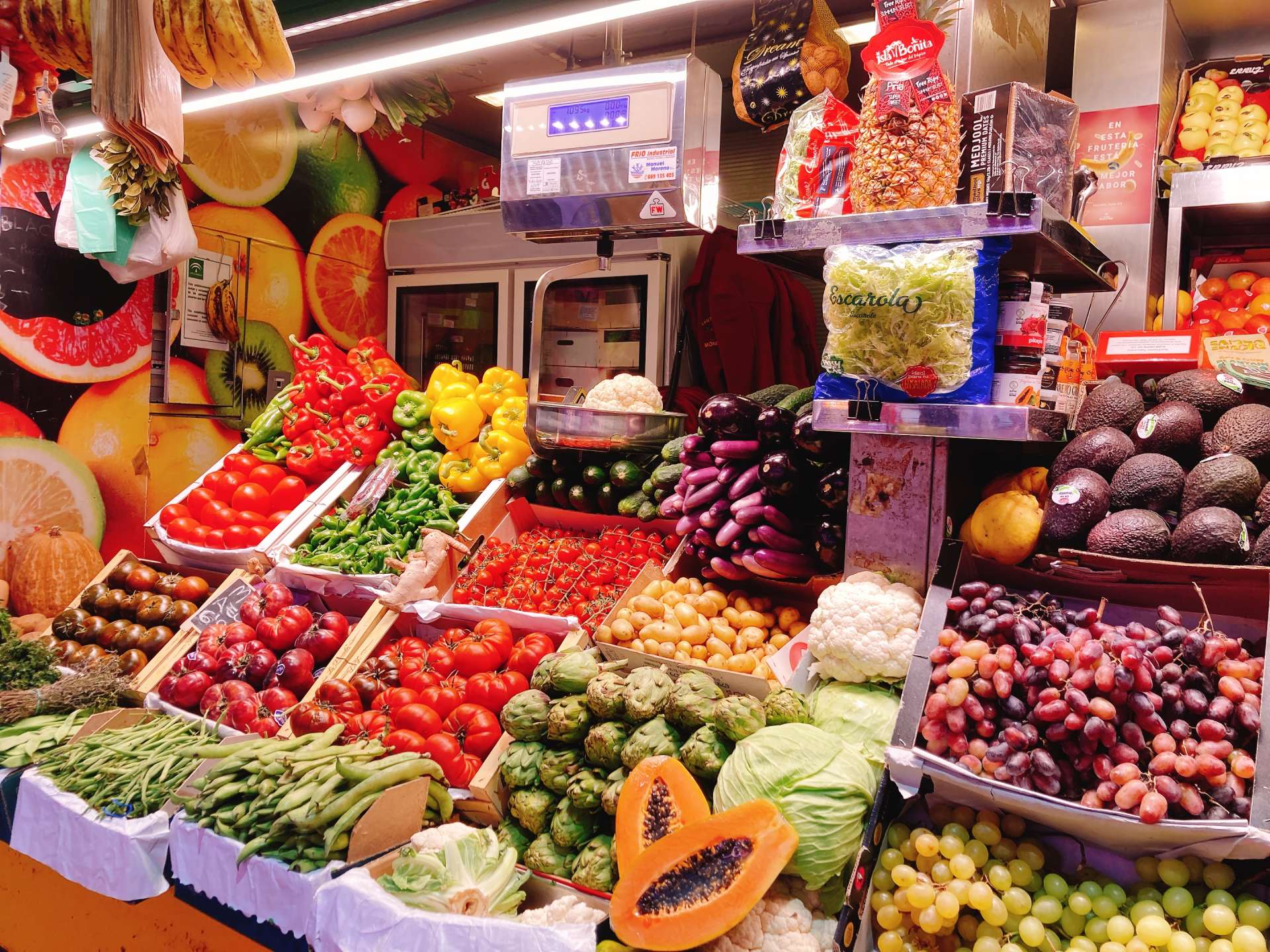 市場にはたくさんの店舗が並び、肉、魚、野菜、果物など新鮮な食材がところ狭しと売られています。