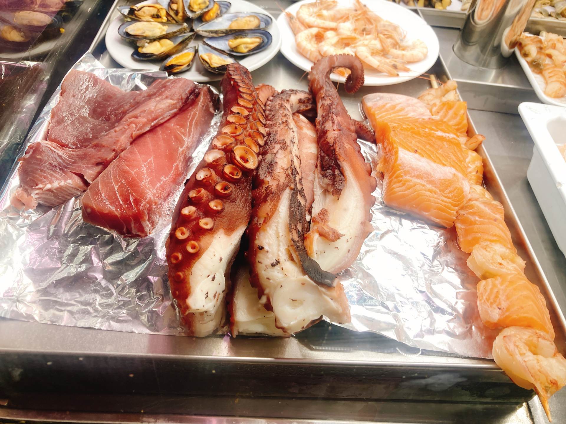 バルも何店かあり、タパスをつまみながらワインやビールと一緒に食べ歩きをすることも可能です。ほかにも生ハムやチーズ、食材を串に刺して盛り付けたピンチョス、アンダルシア州名物シーフードのフリットなど、選びきれないほどたくさんの惣菜が売られています。朝食・昼食用に、気になるものを購入してホテルに持ち帰ってもよさそうです。