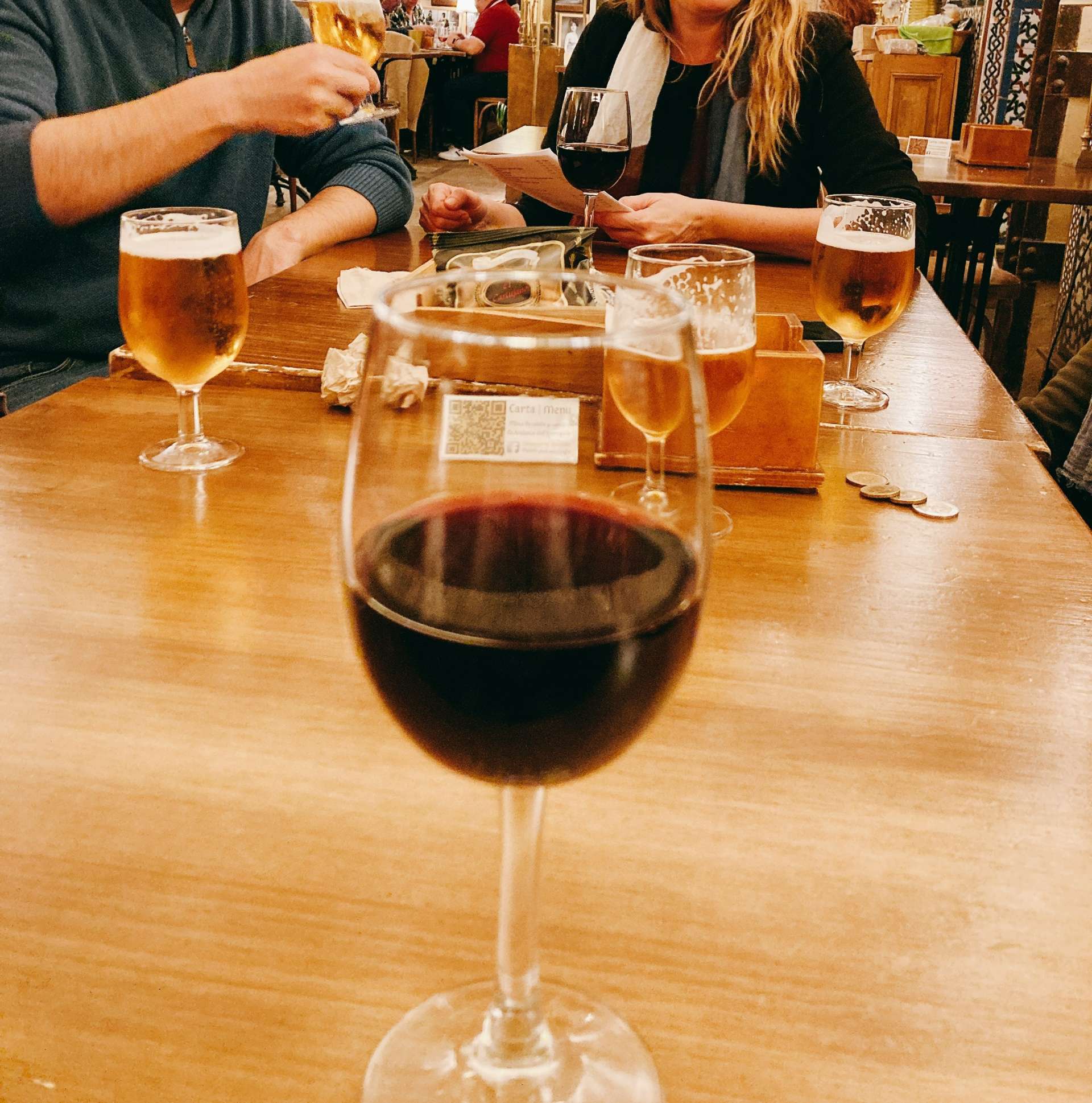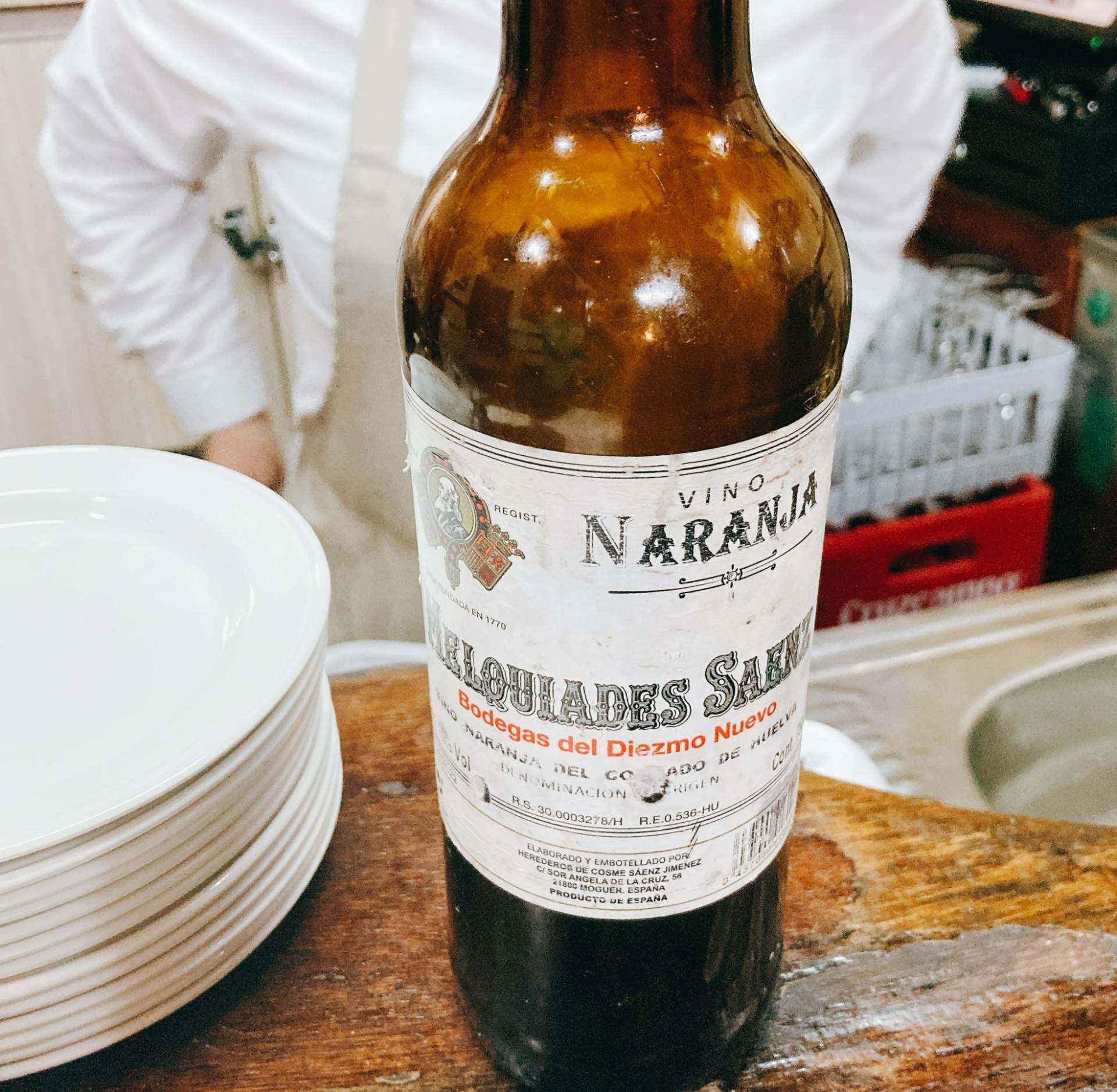 また、このバルではセビージャ名物のオレンジワインが飲めることで有名。口に入れてみると、オレンジの風味と熟成されたコクを感じます。ついジュース感覚でたくさん飲んでしまいそうになりますが、通常のワインと同じくらいのアルコール度数があるので飲みすぎには要注意。ハモン・セラーノと合わせると、塩気とオレンジワインの甘味が絶妙にマッチします。どのバルにもあるわけではないため、メニューにあればぜひ注文したい1杯です。