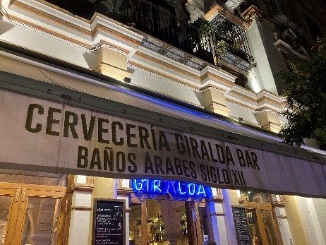 ヒラルダの塔から徒歩約1分の場所にある「セルベセリア・ヒラルダ」は、12世紀に作られたハマム(アラブ式大浴場)を活用したバルです。丸い天井や天窓、絵画はほぼ当時の状態で残っており、歴史的価値の高い遺跡でもあります。このようなユニークな空間で食事を楽しめるのはセビージャでもここだけ。