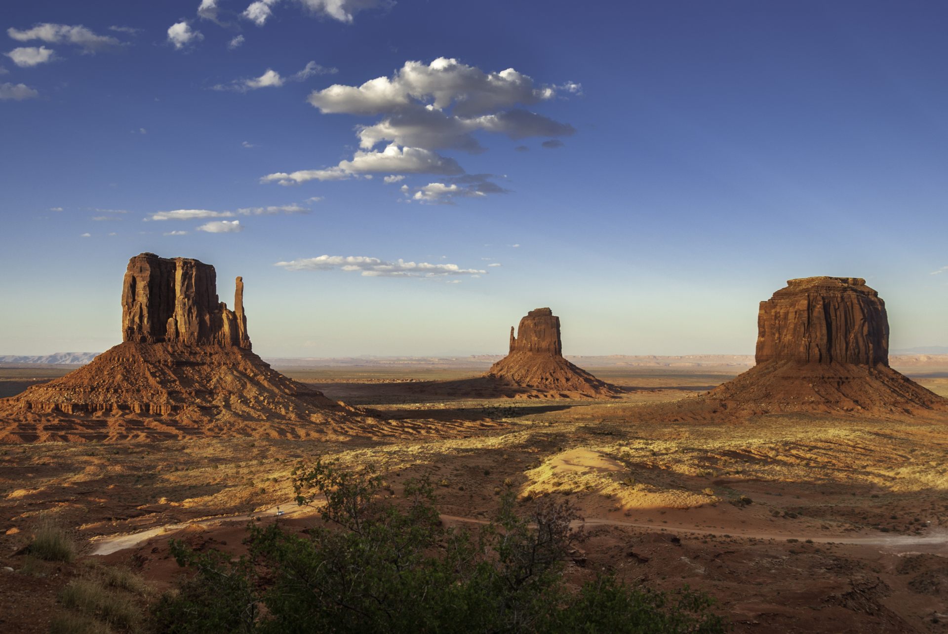 モニュメントバレーを象徴する谷底の3つのビュート(残丘)が並ぶ風景を楽しめるのが、こちらの展望台です。谷の淵に立つビジターセンターの奥にあり、宿泊先としておすすめのビューホテルも真隣に併設されています。ここは朝日の様子から、夕日が反射する時間帯、夕刻のときや真夜中の星の様子など1日を通して景観を楽しめる場所です。
