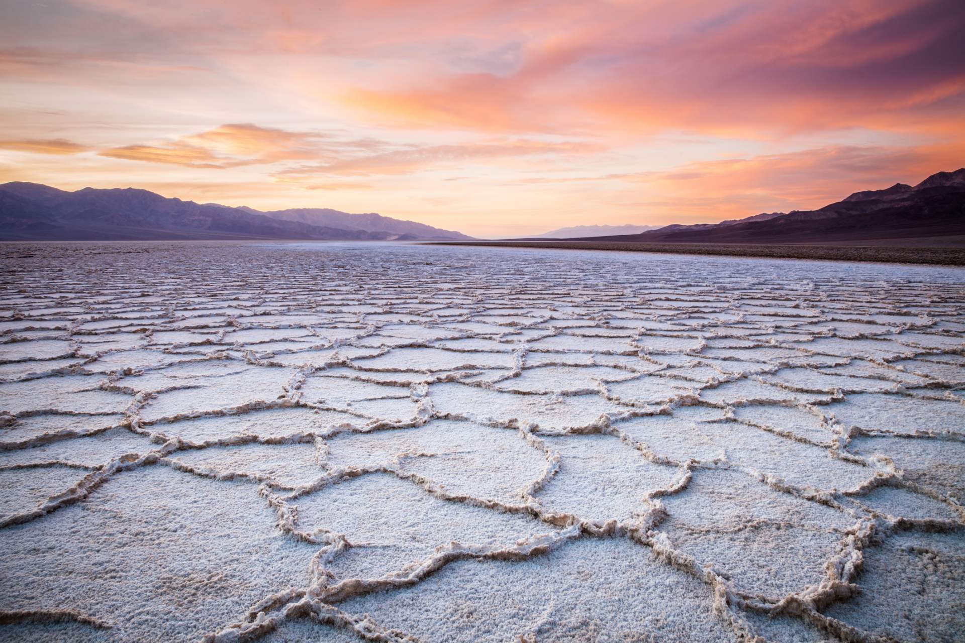 北米で最も標高の低い、海抜マイナス86mの塩平原「バッドウオーター」。ここはまるで別世界のような体験ができる場所として人気です。到着後、道路から400mほど歩くと、塩の地層が大きな多角形の形をした有名なスポットがあり、どこまでも続いているように見えるユニークな風景を形成しています。涼しい時期であれば、奥まで進んでこの非現実な白銀に囲まれた世界を体感してみましょう。