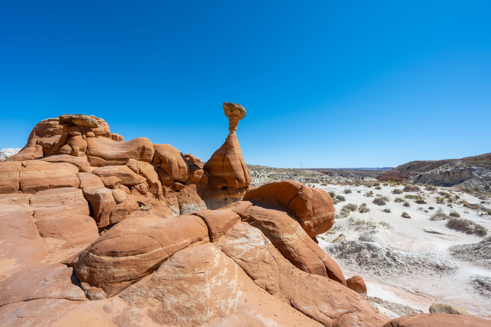 まるで火星に迷い込んだかのような奇景に出合えるのが、カナブとページの中間地点付近、グランドステアケース・エスカランテ国定公園内にある「トードストゥールフードゥー」(キノコ)です。名前のとおり、絶妙なバランスで立つキノコのような形の尖塔群ですが、殺風景な周辺の景色とともに非現実感を体験できます。駐車場からフードゥーまではわずか15分程度のハイクなので、気軽に行ける景勝地としてもおすすめです。