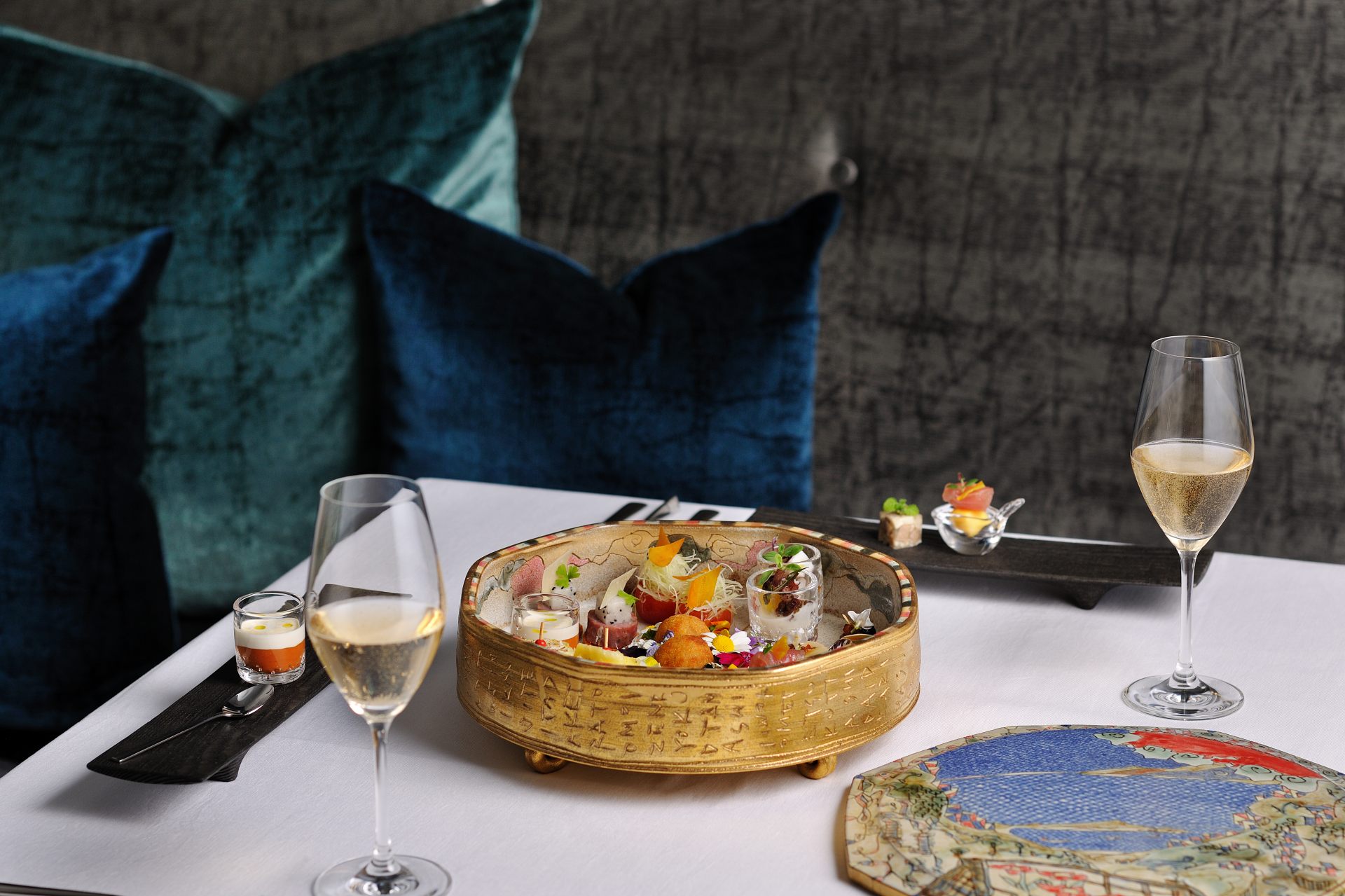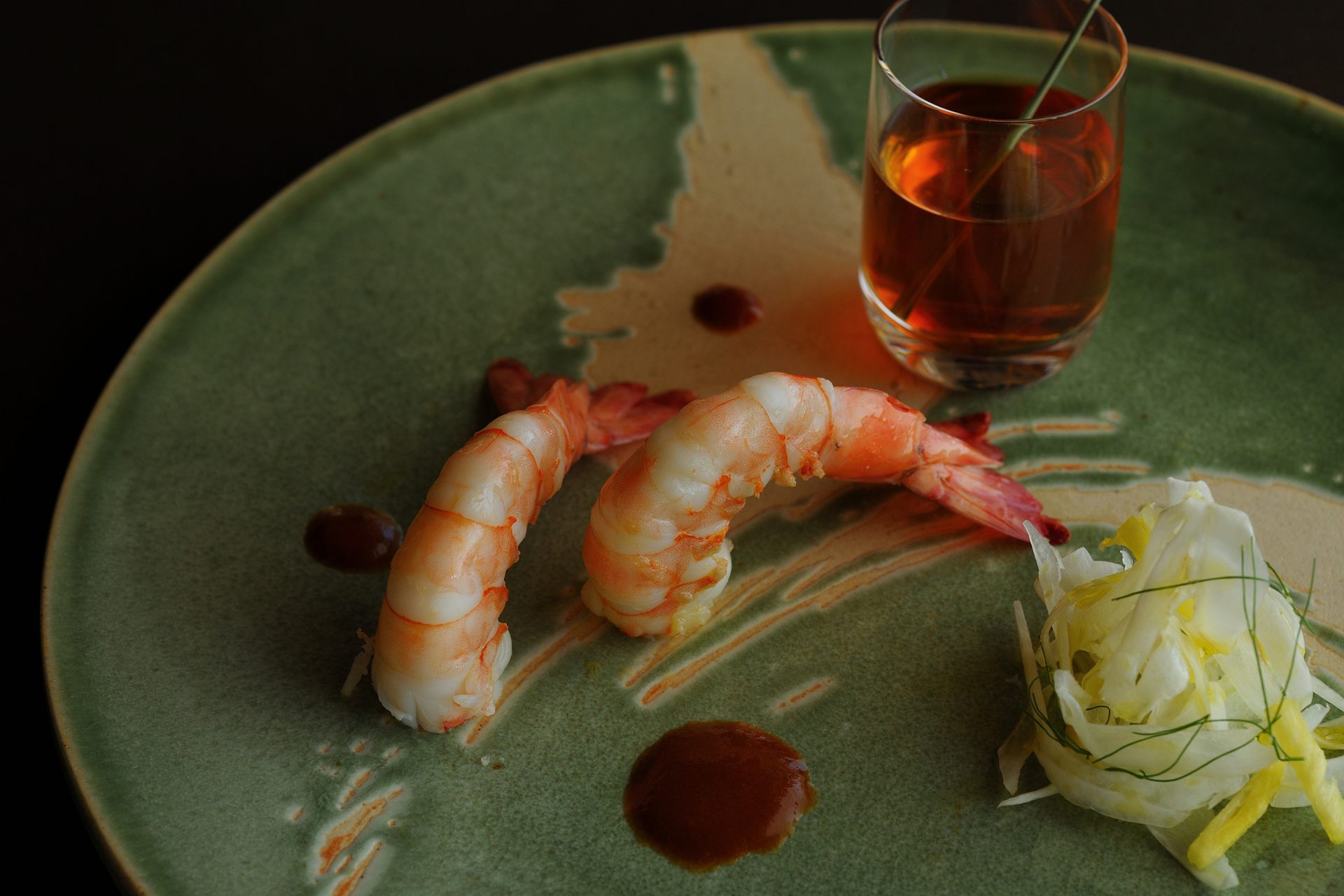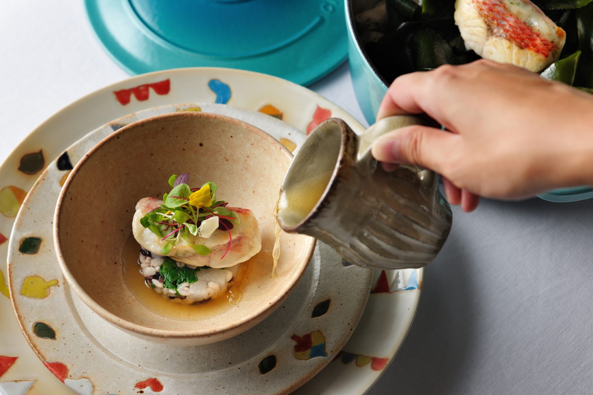 見た目で一番楽しませてくれるのは、琉球王朝時代に宮廷料理で使われていた東道盆(とぅんだーぶん)から着想を得た、前菜の盛り合わせ「ストゥッツィキーニ」でしょう。シークヮーサー風味のアランチーニや、パパイヤシリシリボッタルガ(シリシリとは食材を細切りして炒めあえる沖縄料理)など、琉球シチリアーナを体現したひと口サイズ料理が9品、まるで宝石のように散りばめられています。ディナーコースは全9品(こちらで紹介しているのは2023年2月28日までの秋・冬メニュー)、すべて紹介するとネタバレになってしまうのでこのへんで控えておきますが、食材や味付けのアイデア、そして器のチョイスなど、終始驚きと笑顔に満ちた感動のディナータイムとなりました。