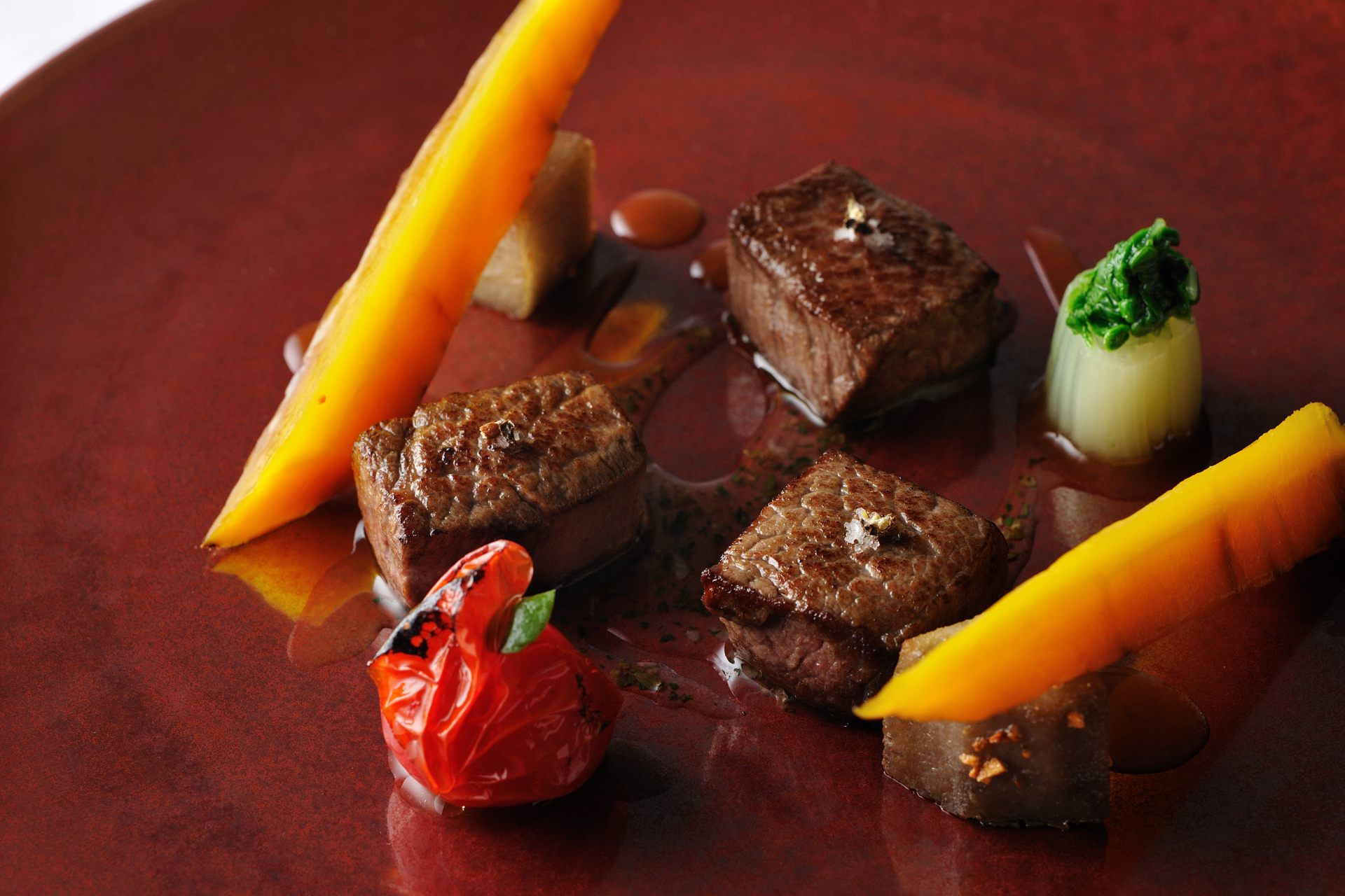 例えば、冷前菜の「車海老とカリフラワー」では、魚介のスープを凝縮したジュレに、カリフラワーのピュレ、さらに沖縄らしく柑橘「タンカン」のピュレを合わせ、キャビアのように輝く「海ぶどう」をトッピング。プチプチとした食感がアクセントになり、琉球シチリアーナの幸先よいスタートを実感することでしょう。また、パスタの「トマトの冷製カッペリーニ」では、秋から冬にかけて沖縄で旬を迎えるトマトを使用。冬でも比較的暖かい沖縄だからこそ冷製パスタで提供し、爽やかな酸味と甘味を届けてくれます。