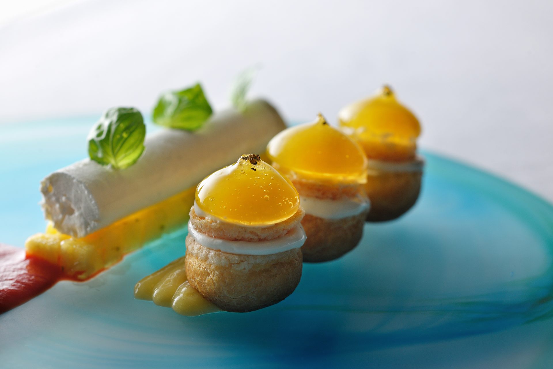 今回取材して紹介するのは「島テロワール」。例えばアミューズの「ガザミと島豆腐のクープ」は、マングローブの生息するワタリガニの一種、ガザミをタルタル状にした上に島豆腐のムースを重ね、上に長命草のソースをかけて閉じ込めた一品。沖縄の食材が層のように積み重なり、ガラスの器越しに見る断面は崩すのがもったいないくらいの美しさですが、ソースからガザミまでをスプーンで同時にすくって味覚の共演を楽しんでみてください。