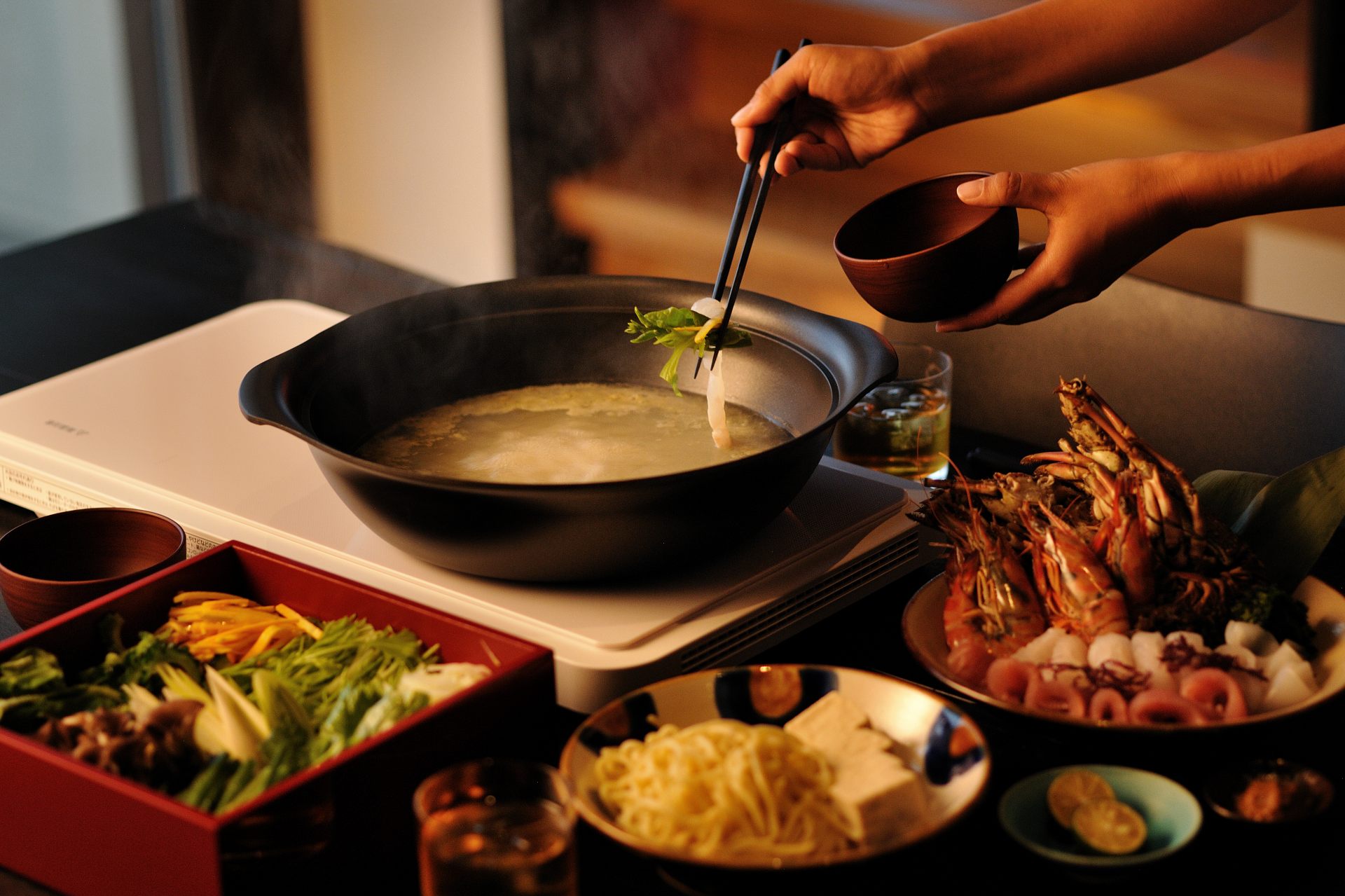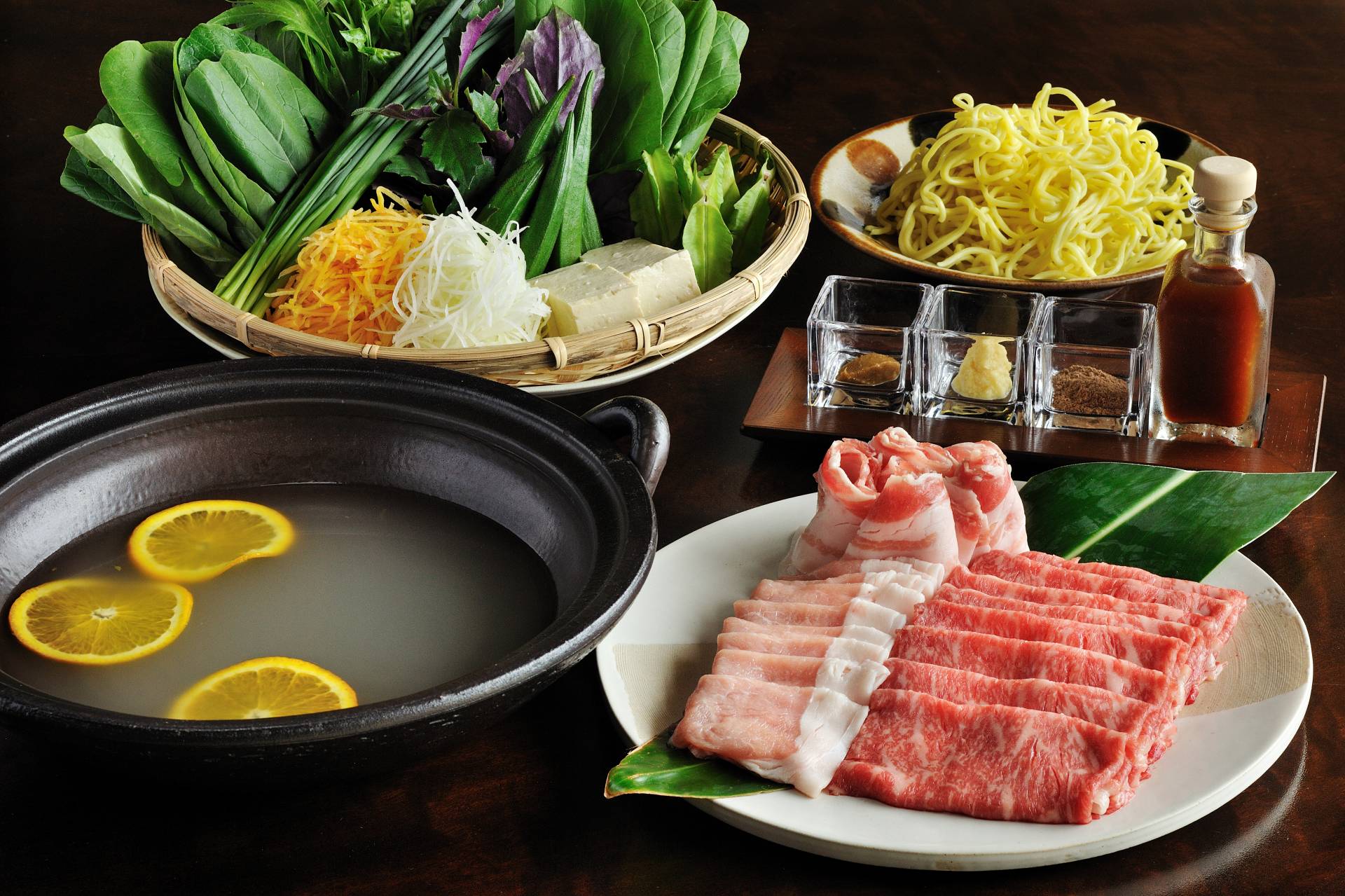 部屋食でおすすめなのが、なんと言っても「柑橘薫る島鍋」。柑橘の薫る出汁に牛ロース肉と豚バラ肉、命草やハーブなどの島野菜などをしゃぶしゃぶでいただく鍋料理で、薬味にポン酢やピバーツ(島胡椒)、シークヮーサー胡椒などを合わせ、さっぱりといただくことができます。締めには残った出汁で八重山そばをいただき、満腹間違いなしのディナーです。