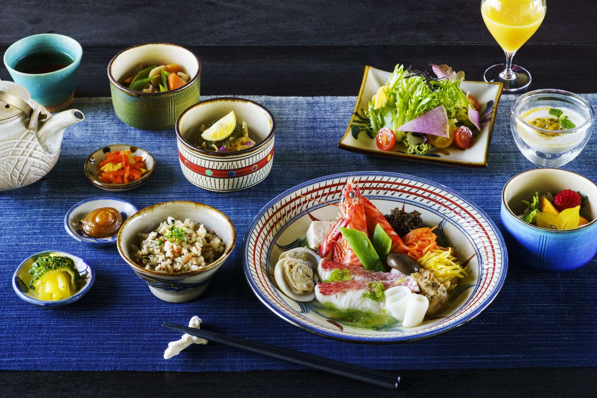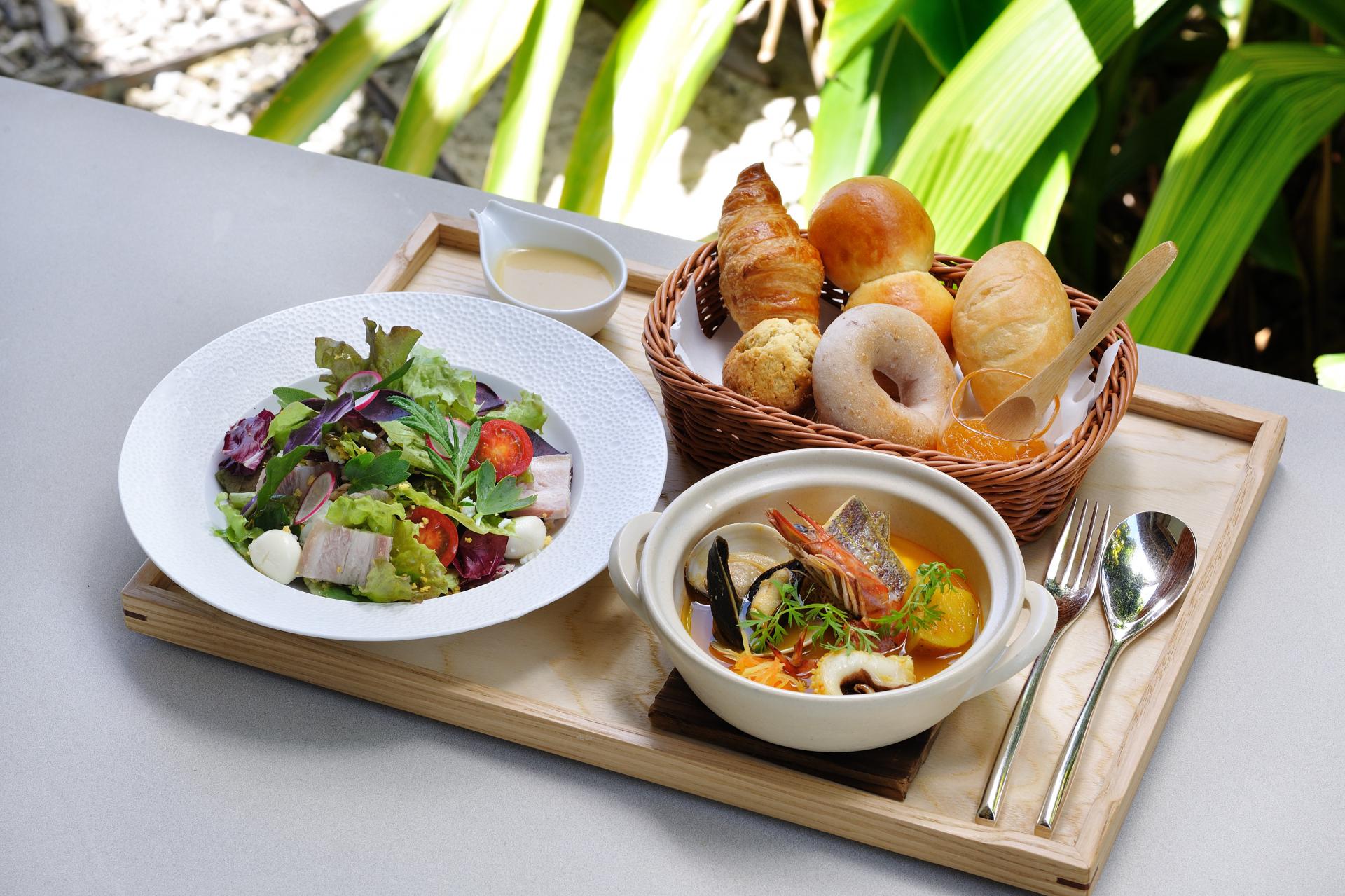 またダイニングでの朝食は、沖縄料理を少しずつ楽しめる「琉球朝食」か、シチリアの郷土料理オレンジのサラダや卵料理などの「シチリア朝食」を選択可能。部屋でいただく場合は、通常のインルームダイニング(和洋2種類あり)のほか、季節によって南国ならではのフルーツを堪能できる「みーくふぁやー果実朝食」や、旬の魚を中心に海の恵みを堪能できる「いまいゆ朝食」など、朝からぜいたくなメニューも楽しめます。