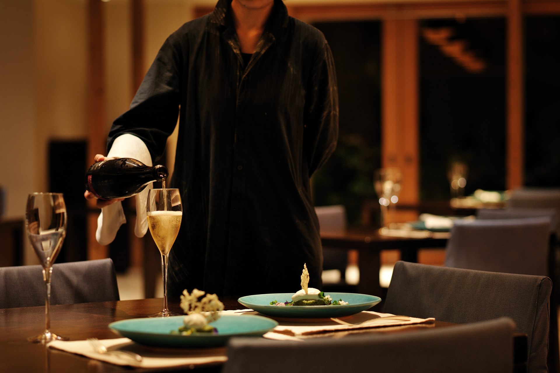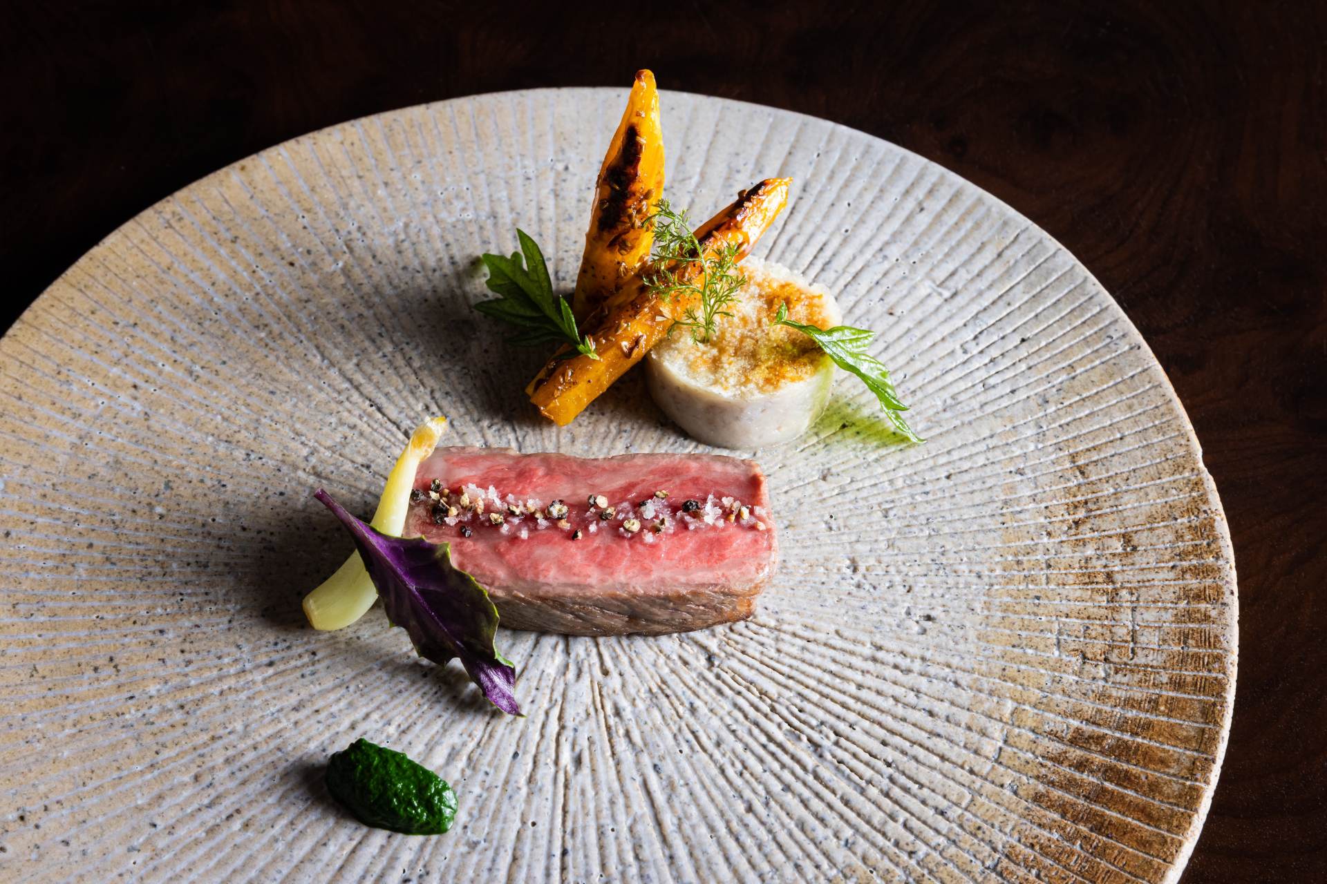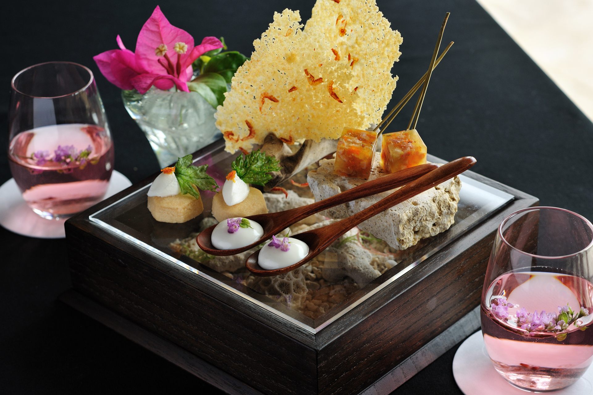 他にも車海老や高級イカ「クブシミ」、あかね芋など、沖縄の海と大地の恵みをふんだんに使った「島テロワール」。2018年以降、毎年冬になると登場する人気コースですが、2022-2023シーズンの最新作では肉や魚介類ではない植物由来食品を主食材とした新メニュー「ディーツのクネル シェーブルクリームソース」が開発されるなど、昨今高まるサステナブルへの関心を受けてバージョンアップが行われています。「琉球ヌーヴェル」を含め何度かいただいたことがあるのですが、毎回新しい驚きに満ちていて、こちらのディナーを目的に「星のや竹富島」に滞在するゲストもいるほどです。