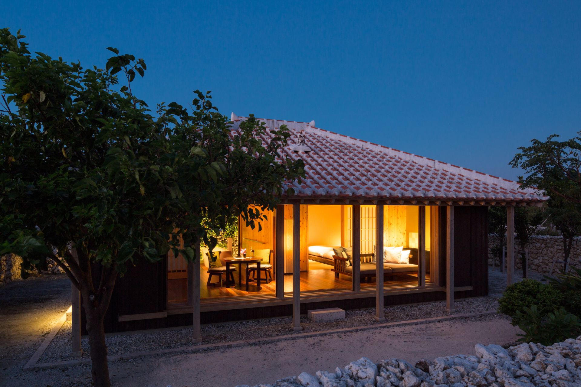 さて、続いて紹介するのは星のや竹富島です。石垣島からフェリーで10分ほどの竹富島は、サンゴ礁が隆起してできた周囲9.2kmほどの小さな島。沖縄の原風景が残ると言われており、島内では独自の伝統文化と景観の美しい3つの集落が大切に保全されています。星のや竹富島の客室群は、島の伝統家屋や集落設計を見事に踏襲し、まるで4番目の集落かのような佇まい。ゲストは一棟ずつ離れになった琉球赤瓦の客室で、島民のように滞在できるのが魅力です。