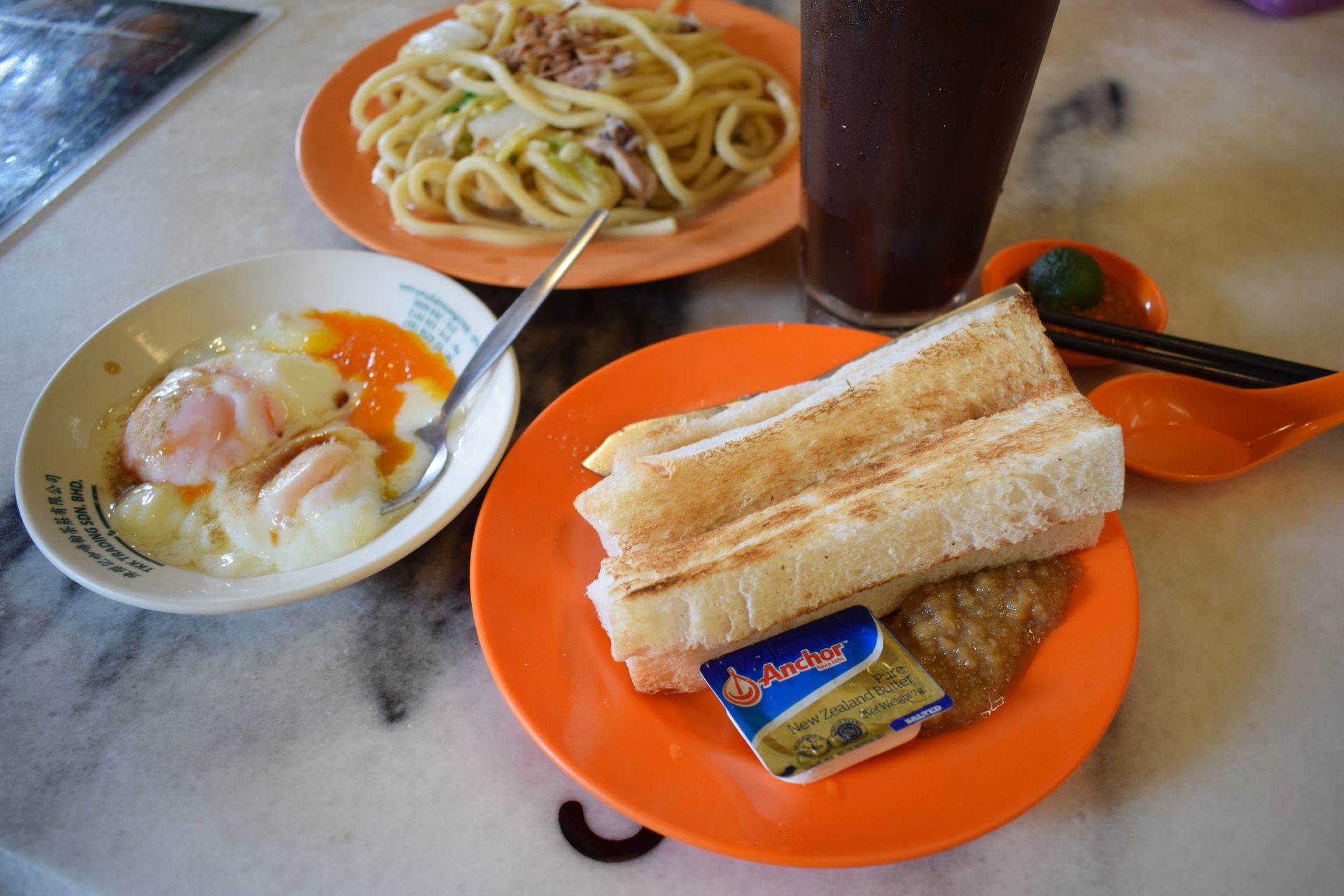 麺やトーストなどマレーシアの定番料理を提供するレトロな喫茶店。土曜の朝10時に訪れると、以前と変わらず人気で、外で20人ほど待っていましたが、ひとりだったので相席でどうぞ、とすぐに案内してくれました。注文したのは、マレーシアの定番朝ごはん、カヤトースト(トーストした薄切りの食パンにカヤジャムとバターをサンドしたもの)と海南麺(ハイラムミー)です。