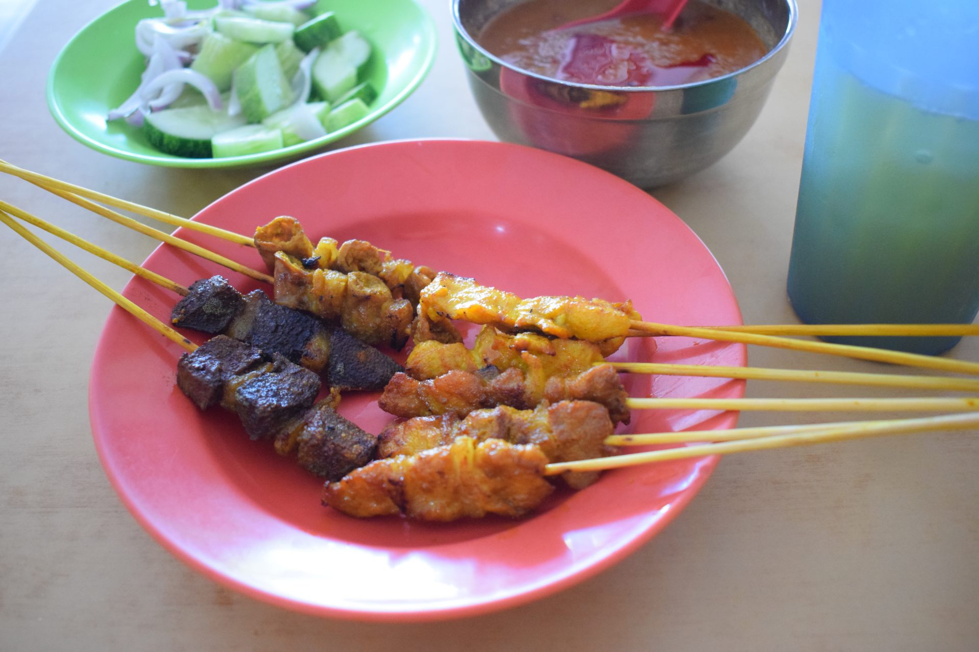 マレーシアではめったにない珍しい豚のサテーが名物。注文したのはもちろん、豚、豚のレバー、豚の腸、鶏といったサテー全4種です。