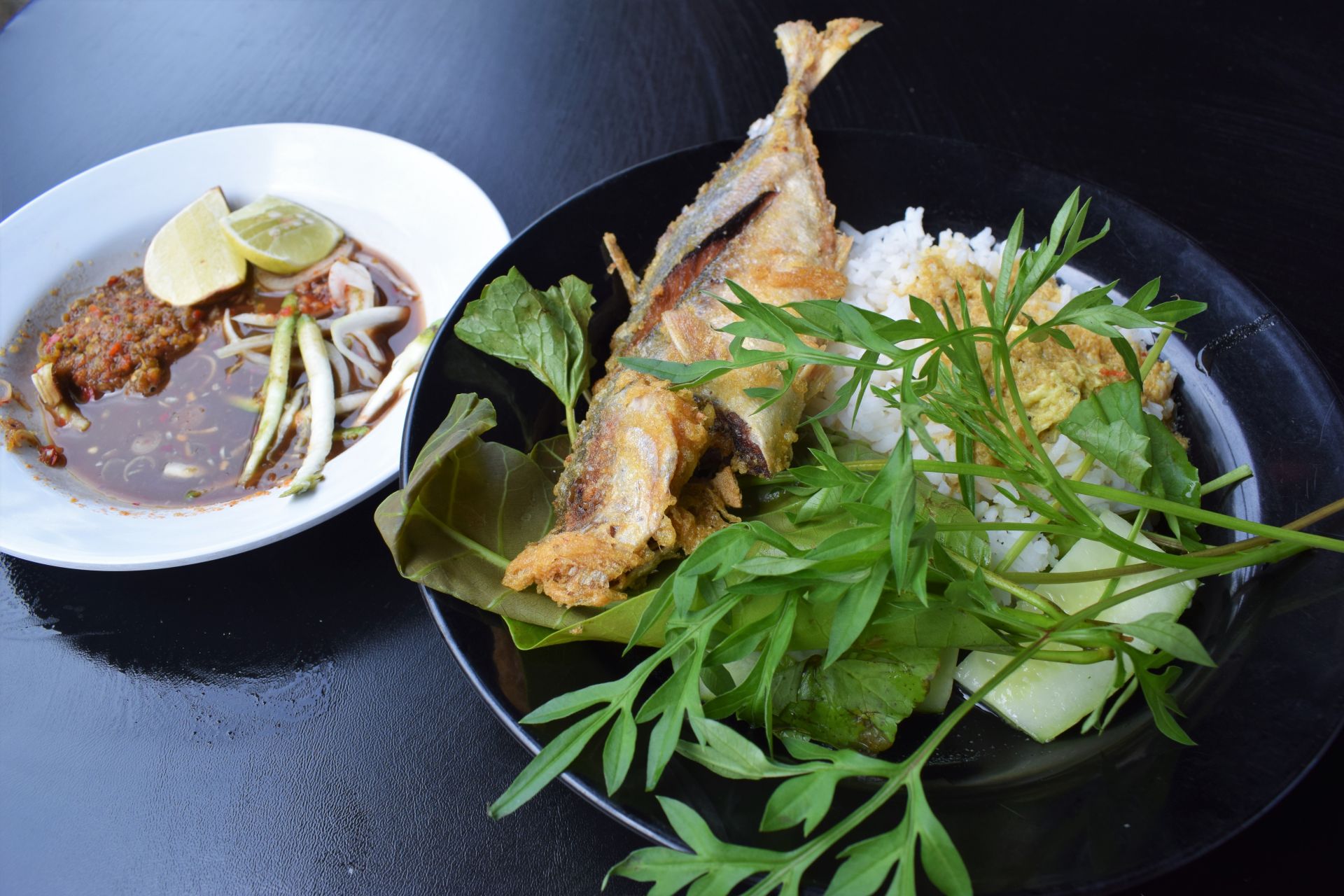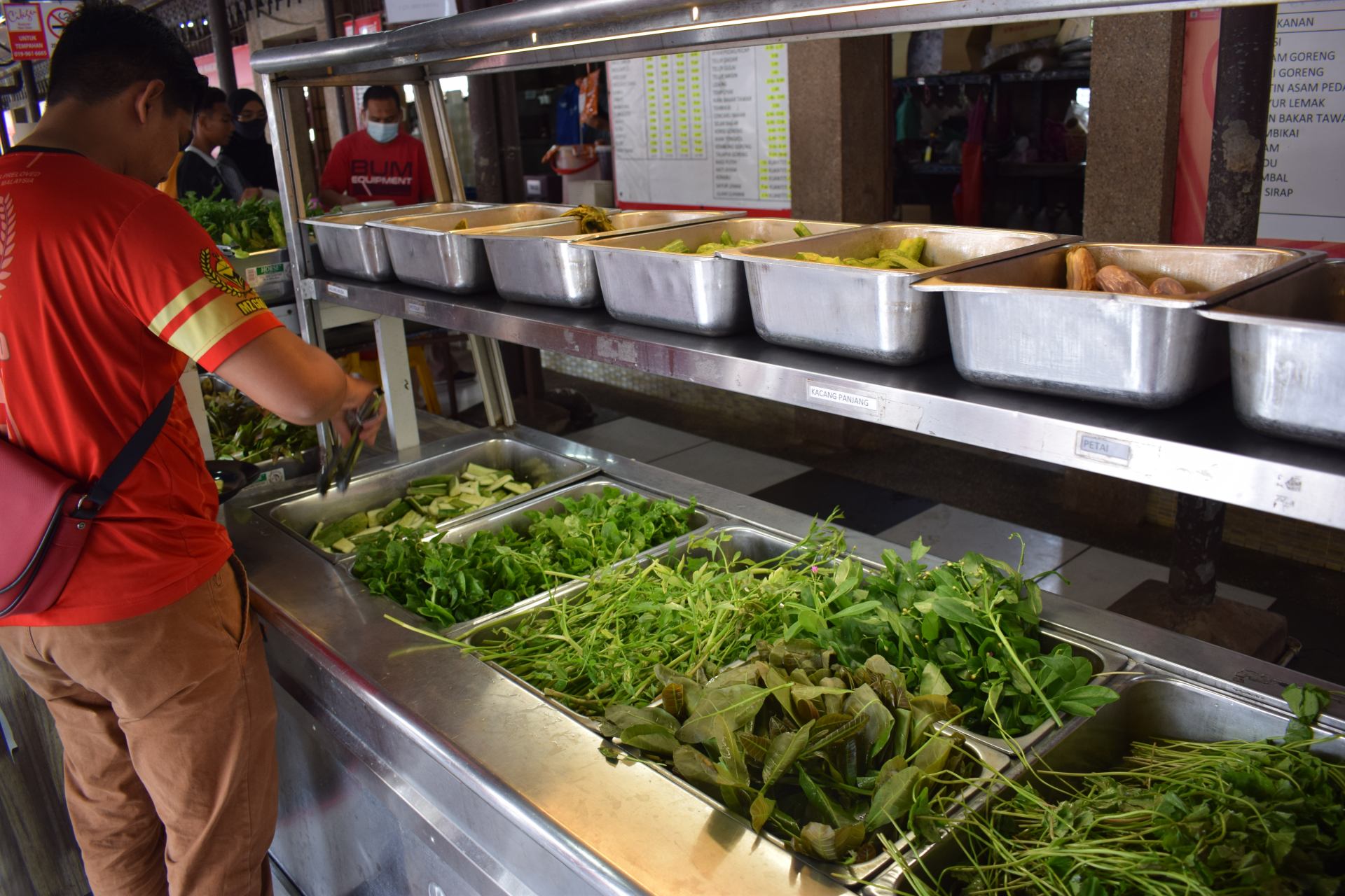 伝統的なマレー料理を提供するナシチャンプル店。魚、鶏、野菜などのおかずをご飯と一緒に食べるスタイルで、生野菜や生ハーブが豊富に揃っているのがこの店の特徴。悩んだ末、揚げ魚をメインに、ご飯にココナッツカレーをかけて、ハーブを数種盛ってみました。
