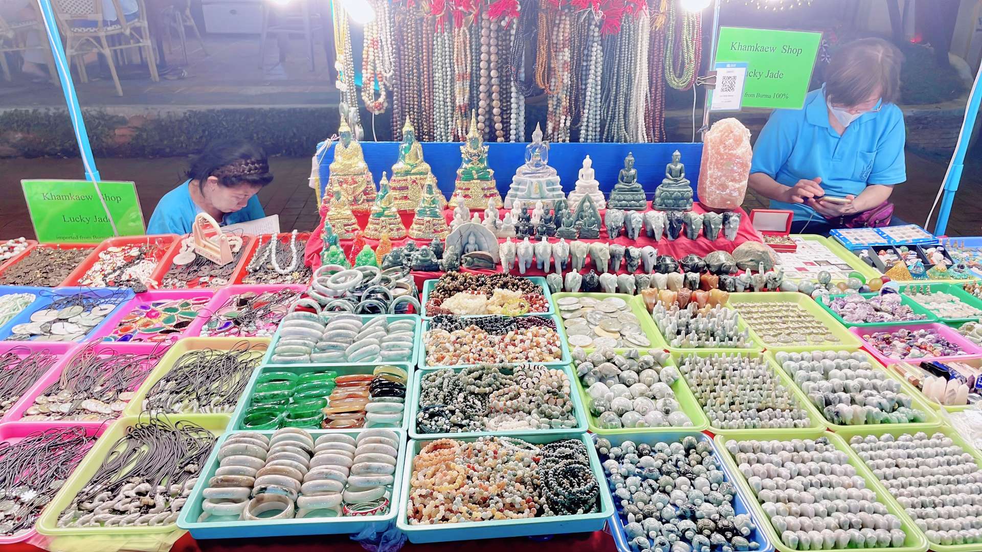 チェンマイの夜をにぎやかに彩るナイトマーケット。夕方頃から店開きが始まりチャン・クラン通り周辺で開催されます。特ににぎやかなのは、ローイ・クロ通りの南側にある「アヌサーン市場」。タイ雑貨や衣料品、食品などの屋台がずらりと並ぶその光景は、日本の祭りとはまた違った熱気があります。