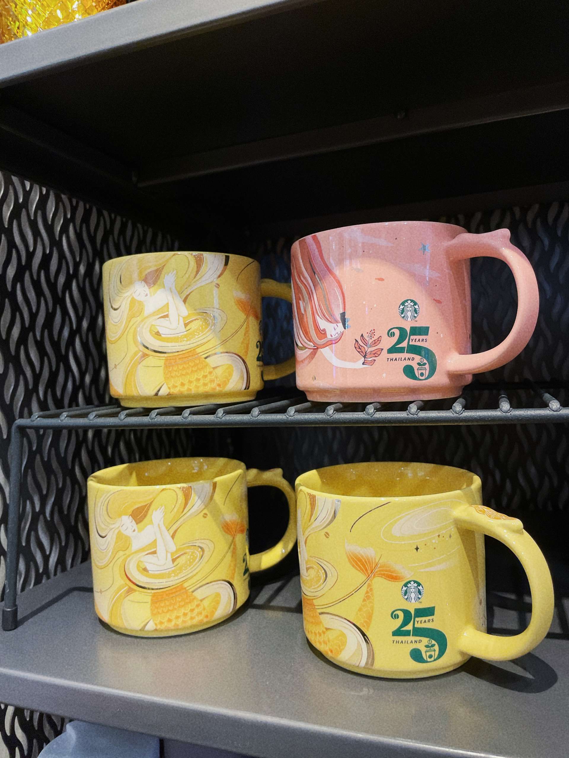 記念マグカップはピンク、ベージュ、イエロー、ブルー、グリーンの5色展開なのだそう。筆者が訪れたときはピンクとイエローの2色がありました。マグカップには、グラデーションカラーの長い髪のサイレンがまるで泳いでいるような、優雅なイラストと25周年のロゴが施されています。世界中のコレクターが熱を上げるスターバックスのコレクション。特にご当地マグカップは旅先の思い出にもなります。