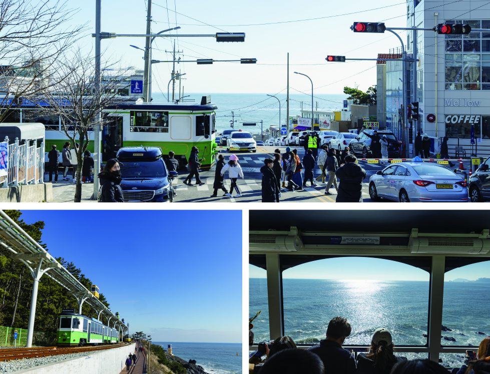 釜山には、海が楽しめるスポットが続々登場! おすすめは海雲台ブルーラインパーク。尾浦-松亭間の4.8kmの海沿いに展開する複合施設です(写真左下)。旧東海南部線の鉄道施設を再利用した「海岸列車」と、その上の軌道を4人乗りの小型モノレール「スカイカプセル」が走行します。海岸列車の社内は大きな窓に向かって椅子が配され、青い海を存分に堪能できます(写真右下)。並行する遊歩道も木道が整備され、海を見ながらのウォーキングを楽しむ地元の人が行き交っていました。