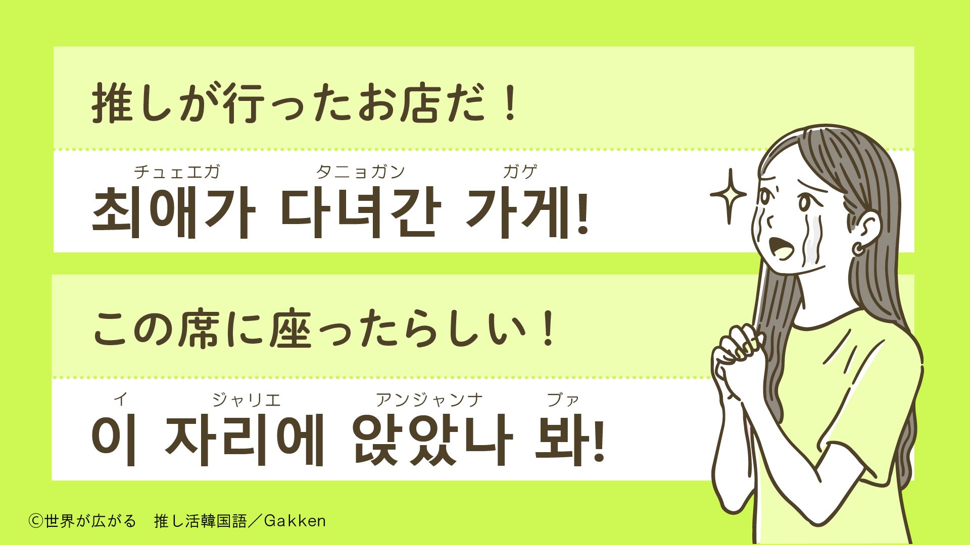 BTSやNCTなどの聖地を巡った際には、韓国語で喜びを表現できると、もっと楽しめるかも。「推しが行ったお店だ!」は최애가 다녀간 가게!(チュェエガ タニョガン ガゲ)、「この席に座ったらしい!」は이 자리에 앉았나 봐!(イ ジャリエ アンジャンナ ブァ)といいます。