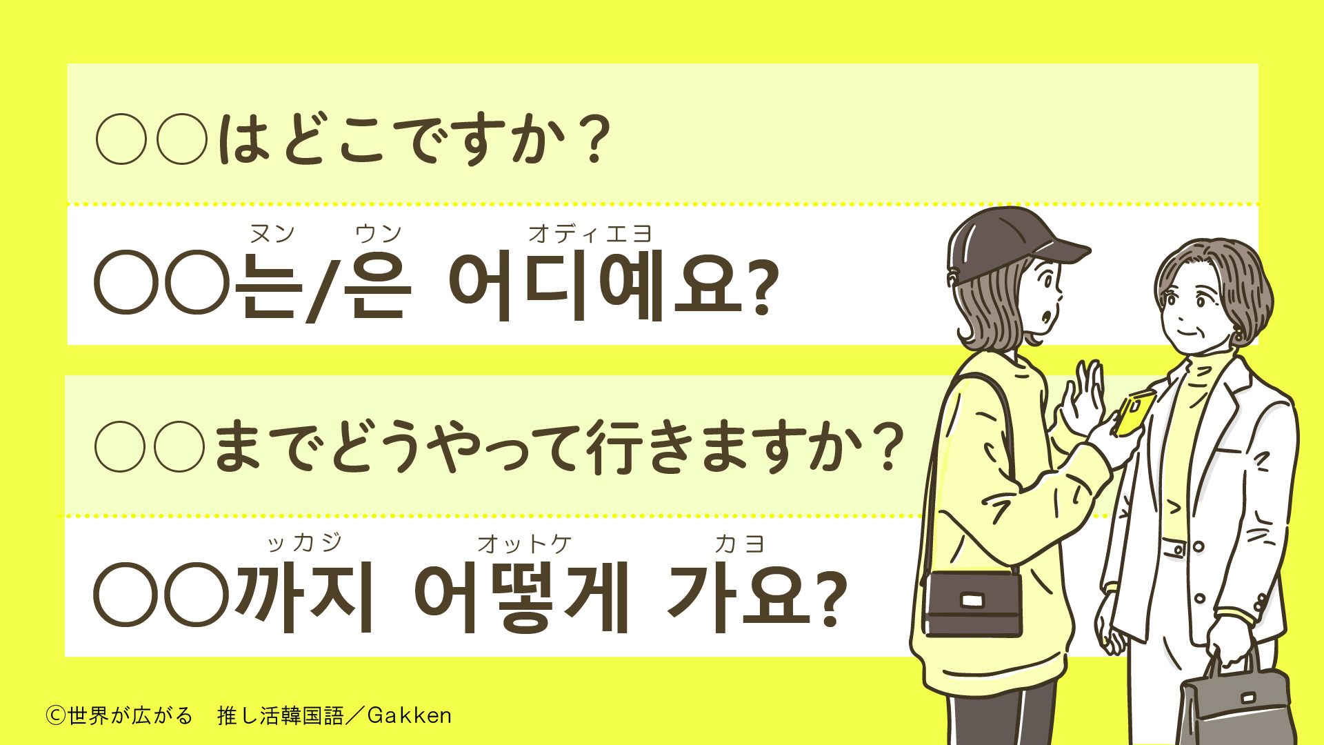 ロケ地への行き方に迷ったときは、思い切って韓国人に道を尋ねてみましょう。「○○はどこですか?」は○○는/은 어디예요?(○○ヌン/ウン オディエヨ)。「~は」などの韓国語の助詞は、前に来る言葉によって使い分けます。○○が母音で終わる(パッチムがない)場合は는(ヌン)、子音で終わる(パッチムがある)場合は은(ウン)を使いましょう。
