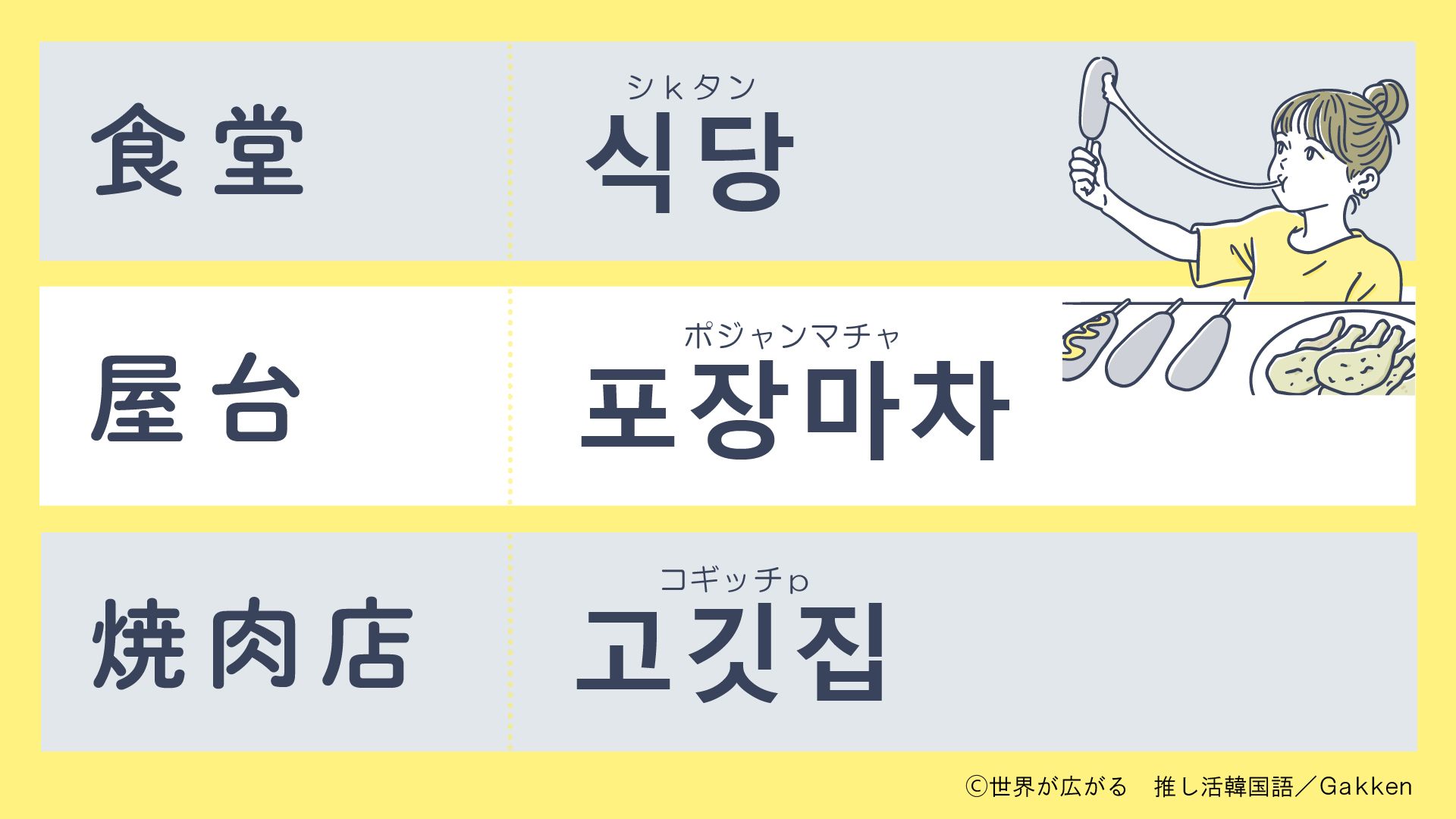 ソウルでは外せないグルメスポット、「食堂」は식당(シkタン)、「屋台」は포장마차(ポジャンマチャ)、「焼肉店」は고깃집(コギッチp)といいます。ちなみに、「メニュー表をください」は메뉴판 주세요.(メニュパン チュセヨ)、「おすすめは何ですか?」は추천 메뉴는 뭐예요?(チュチョン メニュヌン ムォエヨ)といいます。
