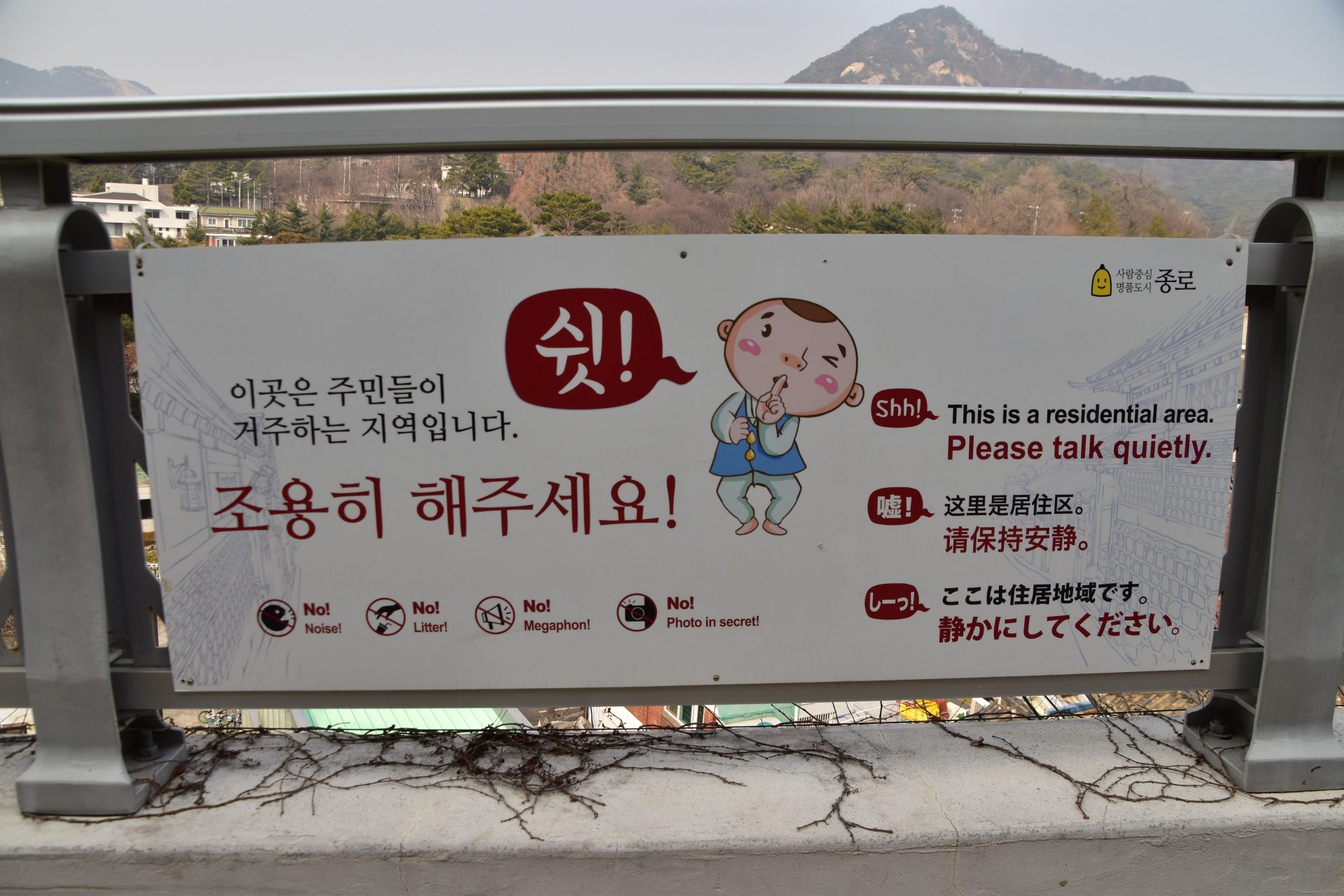 北村韓屋村は住宅地でもあるので、住民の迷惑にならないよう静かに歩くようにとの案内看板があります。大声で話さず、静かに韓屋の景色を楽しんでください。