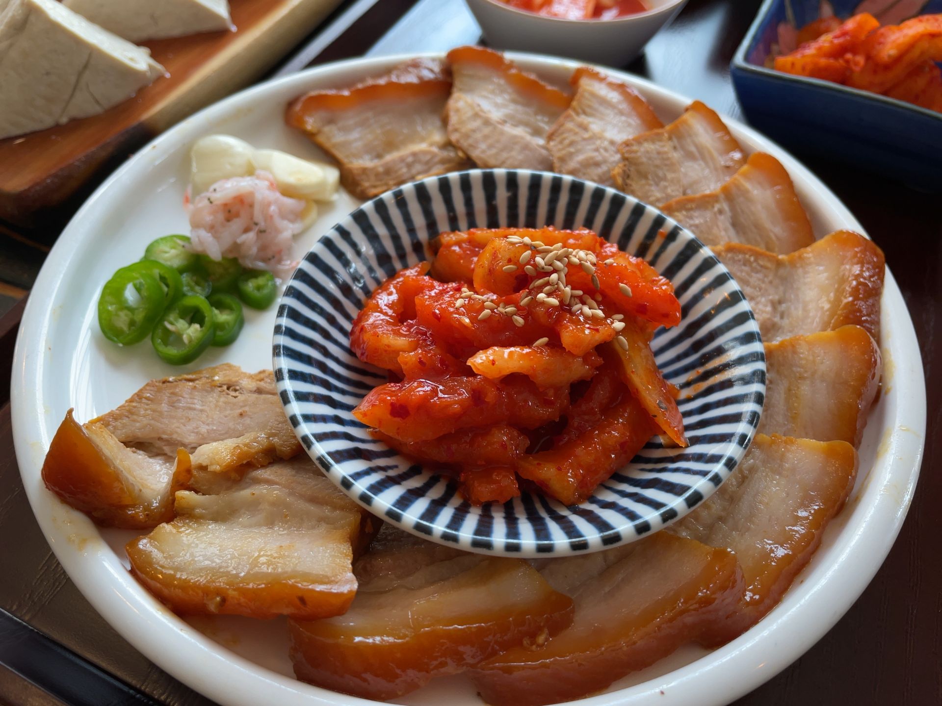 週末はランチスペシャルメニューがあり、ポッサムという茹でた豚肉と手作り豆腐とおかずのセットで1万2500ウォン(1人前の価格、2人前以上要注文)です。