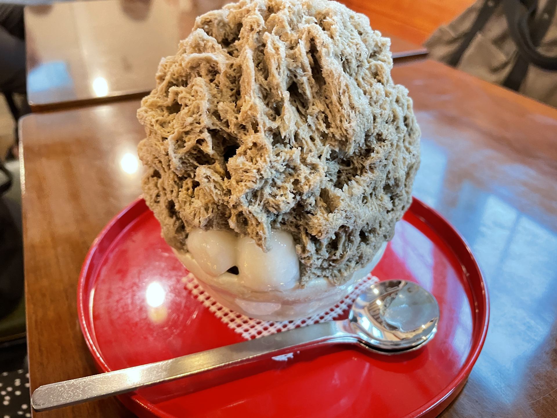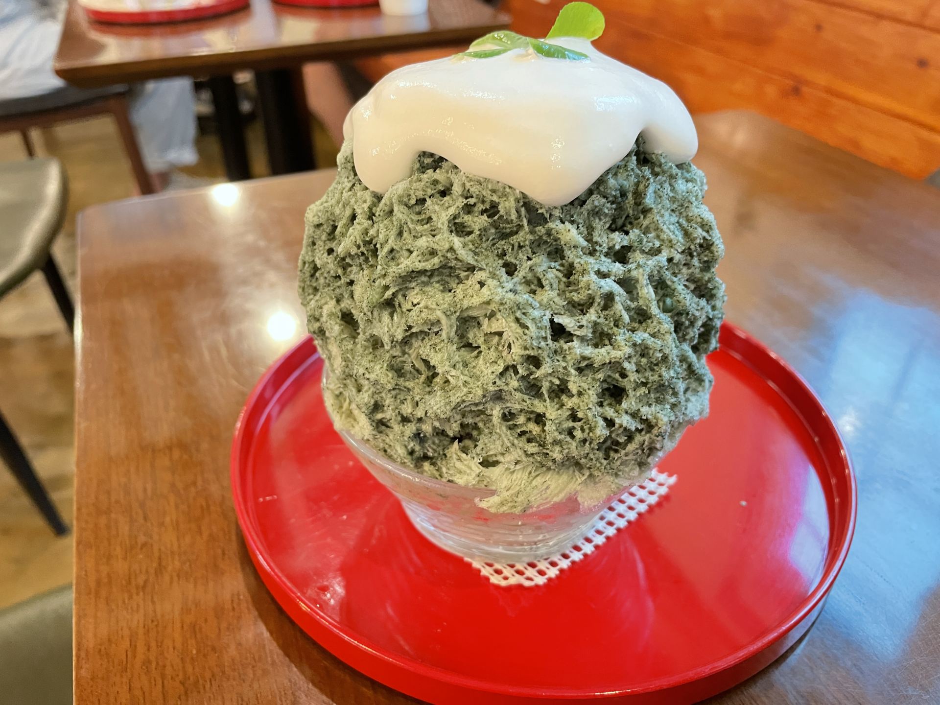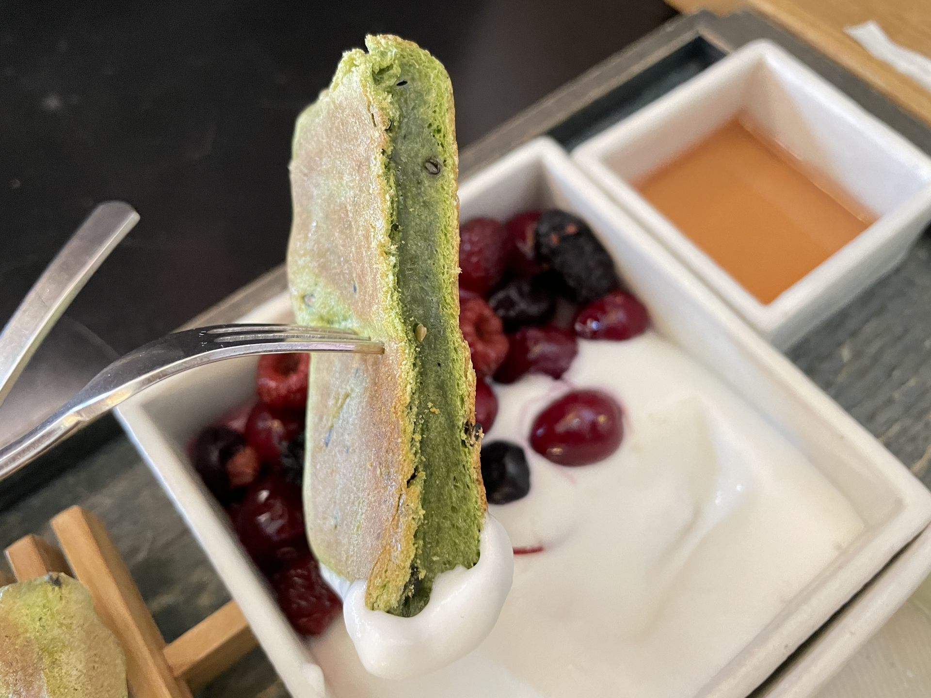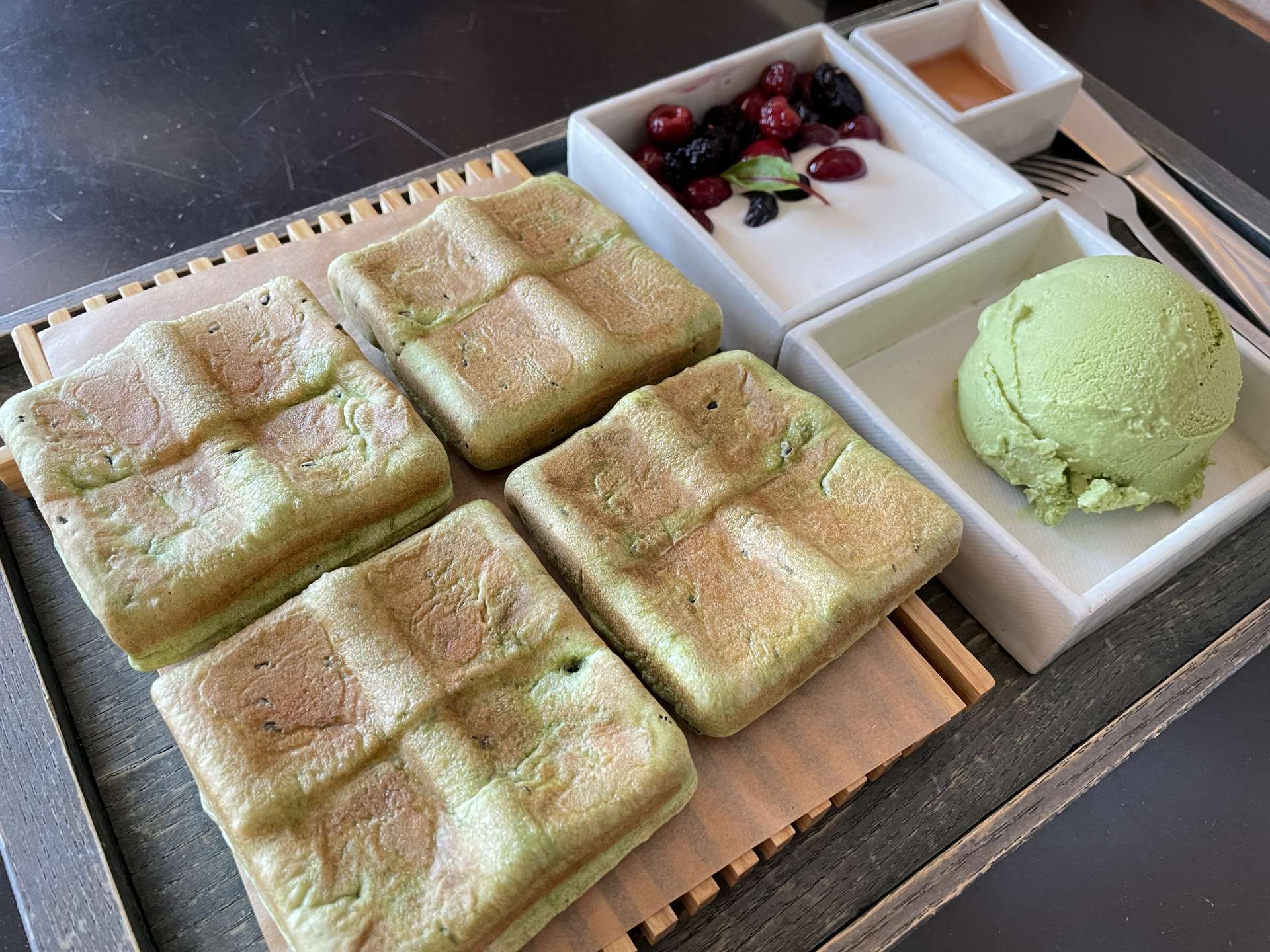 人気メニューのためできあがるのに1時間ほど待ちましたが、瓦の形をした緑茶もちのワッフルはここでしか食べられないので、時間があれば注文必至です。ラズベリーと生クリーム、メイプルシロップ、緑茶のアイスクリームが付いています。