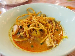 この日の夕飯はチェンマイ名物のカレーヌードル・カオソーイ(40バーツ、約106円)。