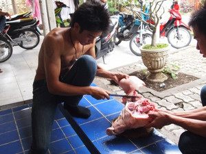 チェンマイの街を散策中、豚の頭を切っている男性グループがいました。 驚きながらも近づくと、おぉっ!?