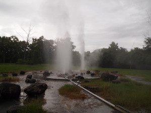 到着したのは「SANKAMPAENG HOT SPA」というキャンプ場のような施設。ふと見ると、すごい勢いで温泉が噴き出ているではないですか!
