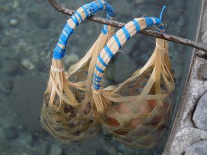 そう、ここの名物は温泉たまごなんです。専用のカゴと卵を購入して、温泉の中にIN。
