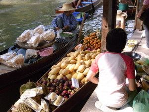 カラフルなフルーツやタイ料理を売るボート、高く積み上げられた帽子や土産物を売るボートが行き交い、観光客はボート上で通りすがりに買い物が出来ます。