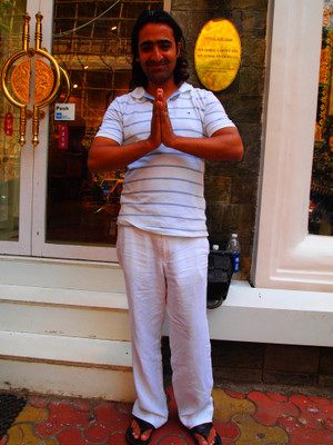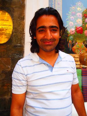 タージ・マハルホテル近くの高級土産物店で働くガハールさん。撮影をお願いすると、何度も鏡をチェック! いかにもインドらしい顔立ちの彼は、その立ち振る舞いや言動から、プレイボーイの香り…。現在、彼女はいないそうで、「日本人の女の子と友達になりたい」んだそう