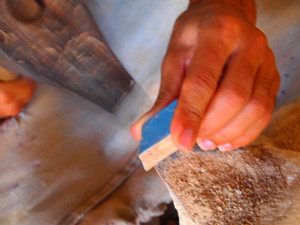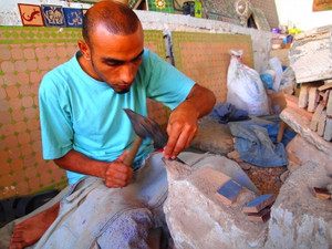 職人さんがタイルを削る様子。