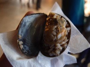 こちらも屋台にて。ムール貝の中にピラフが入っていて、何個でも食べれしまう!