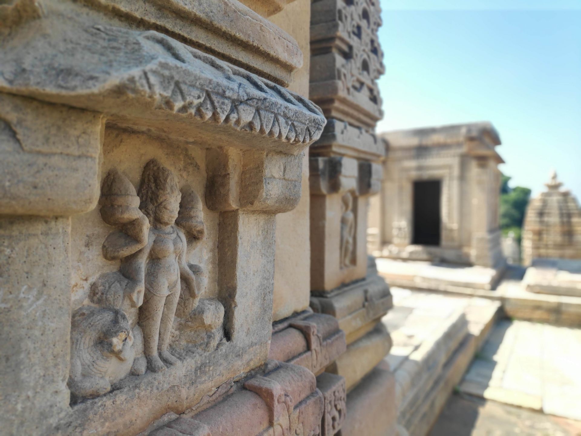 敷地の中に入ると、目の前に砂岩でできた何十もの塔のようなものが現れます。主にヒンドゥー教のシヴァ神を崇めるために建設された小さな寺院です。カジュラーホーの典型的な寺院である、ナーガラ様式と呼ばれる砲弾型の塔を小さくしたような構造物は、丘の側面に3~4段に分けて整列しています。長い年月の間、雨風にさらされ地震にも見舞われたため、崩れ落ちているものも。敷地の奥には主殿があり、こちらも半分崩れかかっているものの、なかには司祭がいます。
