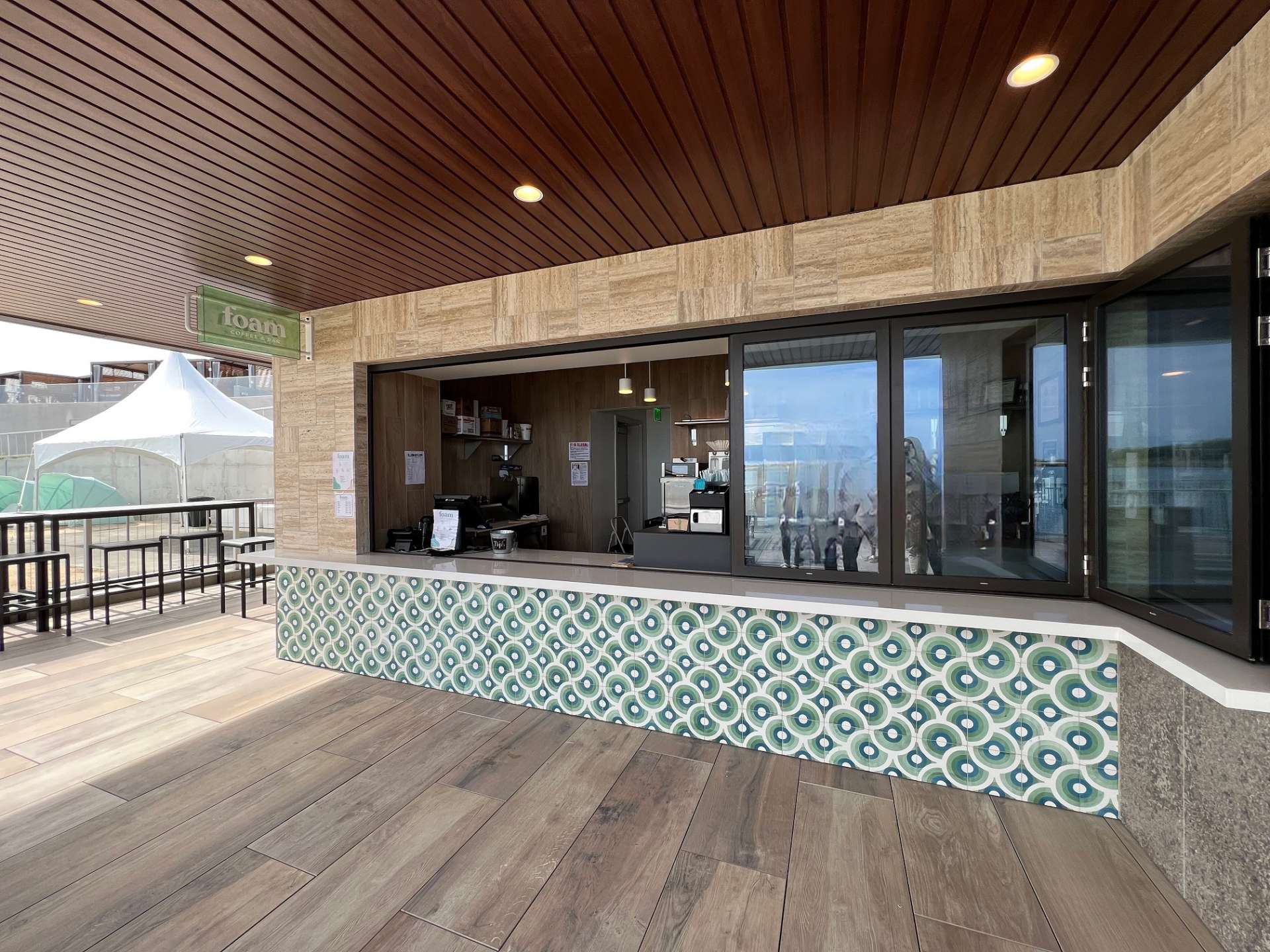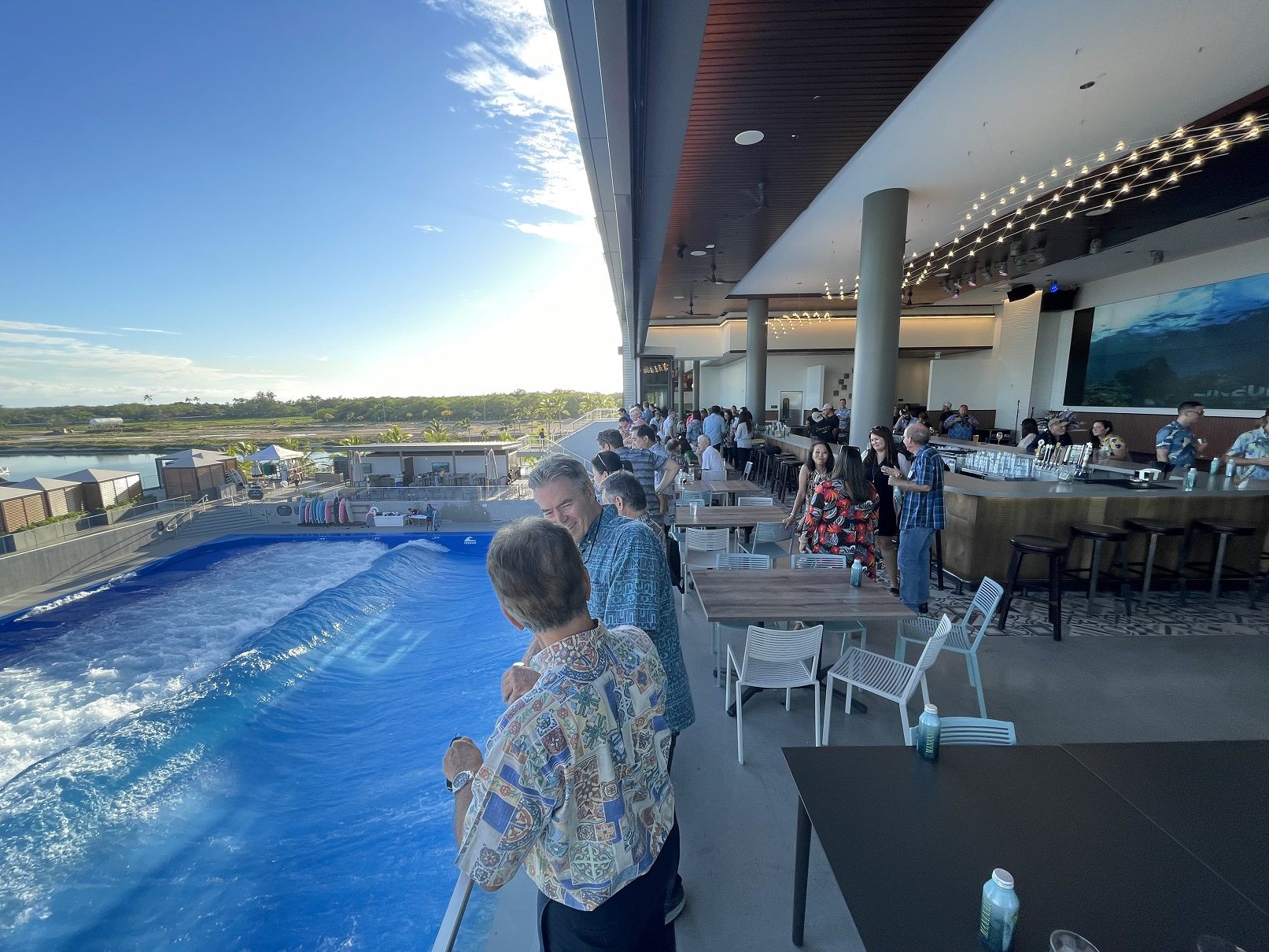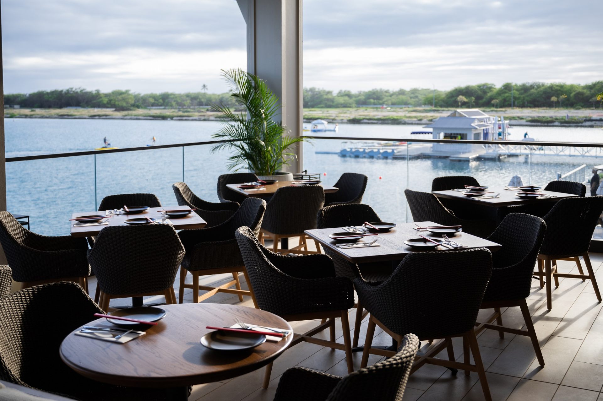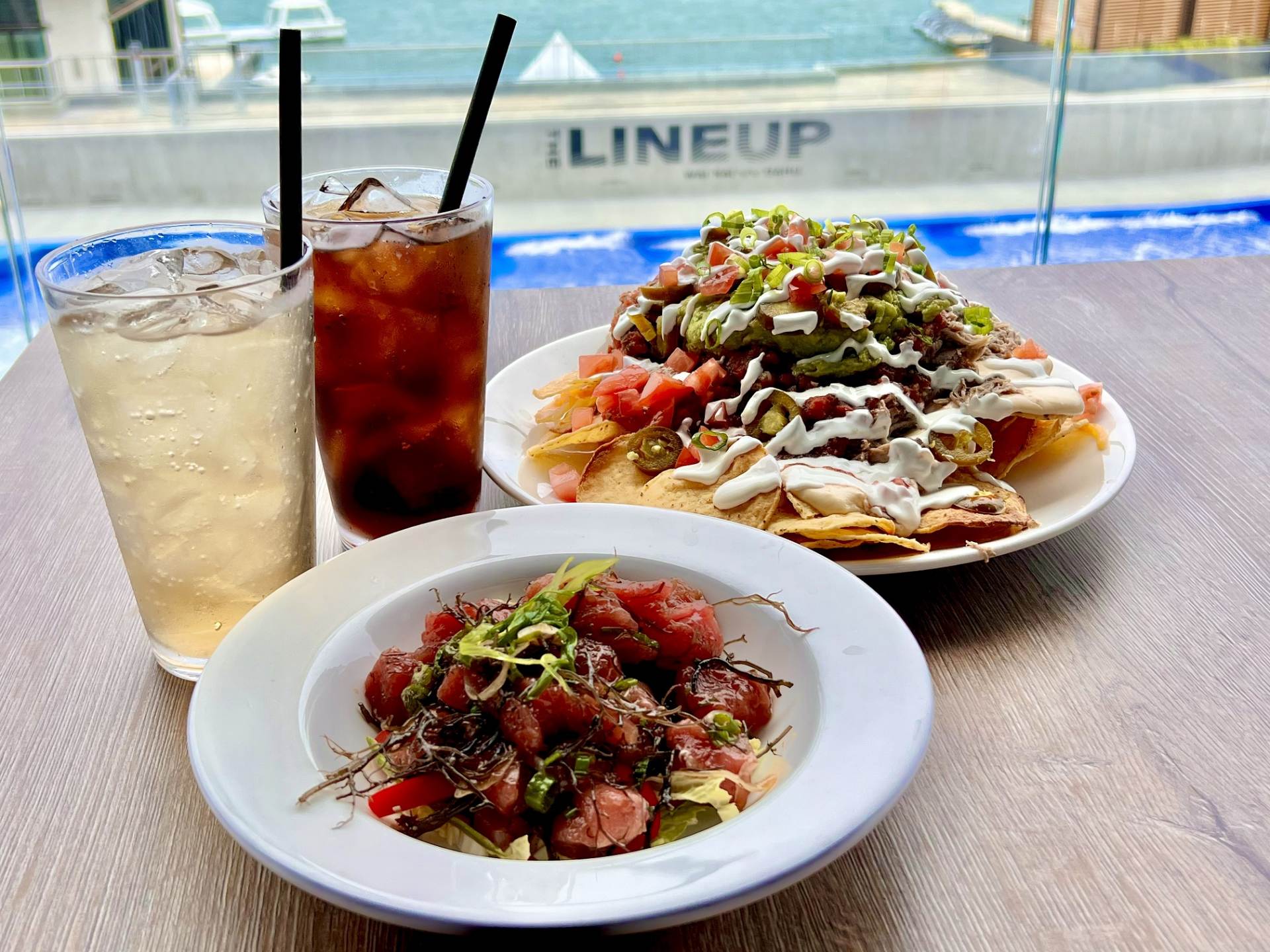 オーシャンフレンドリーレストラン(※)である「ルックアウト フード&ドリンク」では、広々としたラナイ(ベランダのようなエリア)とウェーブデッキからサーフィンを最前列で見ることができ、目の前に広がるワイカイラグーンや隣接する太平洋を眺めることができます。