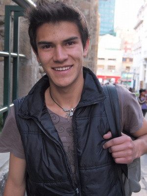 急な坂のサガルナガ通りをすごい勢いで歩いていたエスレボンくん。声をかけるために急いで追いかけたんですが、声をかけたころには息切れ。これから友人との待ち合わせがあるため急いでいたそうなんですが、わざわざ足を止めてとっても丁寧に対応してくれました。パッと見あまりボリビア人っぽくない顔立ちですが、純ボリビア人。よく「ハーフですか?」と言われるそう。趣味でバスケットをしており、毎朝早起きしてバスケットの練習をしているんですって。「応援に来てくれる彼女ができたらいいな」とエスレボンくん。さわやかで整った顔立ちと優しい性格。エスレボンくんに彼女が出来る日も近いのでは?と思うのでした。