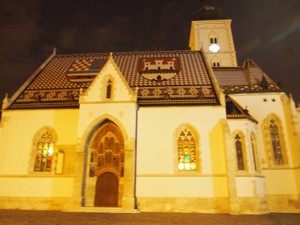 これはクロアチアの国旗とザグレブのマークが付いたかわいい屋根の教会。