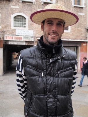 ヴェネツィアの名物ゴンドラの漕ぎ手(ゴンドリエーリ)をするリカルドさん。スラッとした長身と、さわやかな笑顔のイケメンゴンドリエーリです。この仕事に就いて3年目。お客さんを乗せていないときは、リアルト橋の近くにいるそう。こんなイケメンの漕ぐゴンドラに乗れば、美しいヴェネツィアがさらに輝いて見えるはず!ちなみにゴンドラの値段は6人乗りで€70~です。