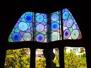 グラシア通りに面した青いガラスの大きな窓。