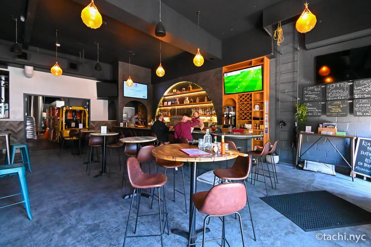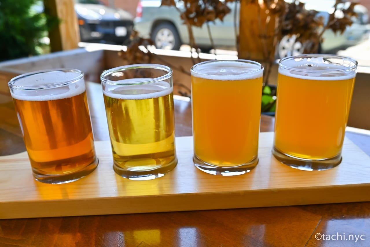 住宅街のなかに現れる「ケグ&ランタン・ブリュワリー」は、洗練された雰囲気が目を引きます。利用客は、ウォーターフロントに住む地元客が多い様子。筆者はテイスティング・フライト(4種のビール)を注文しました。