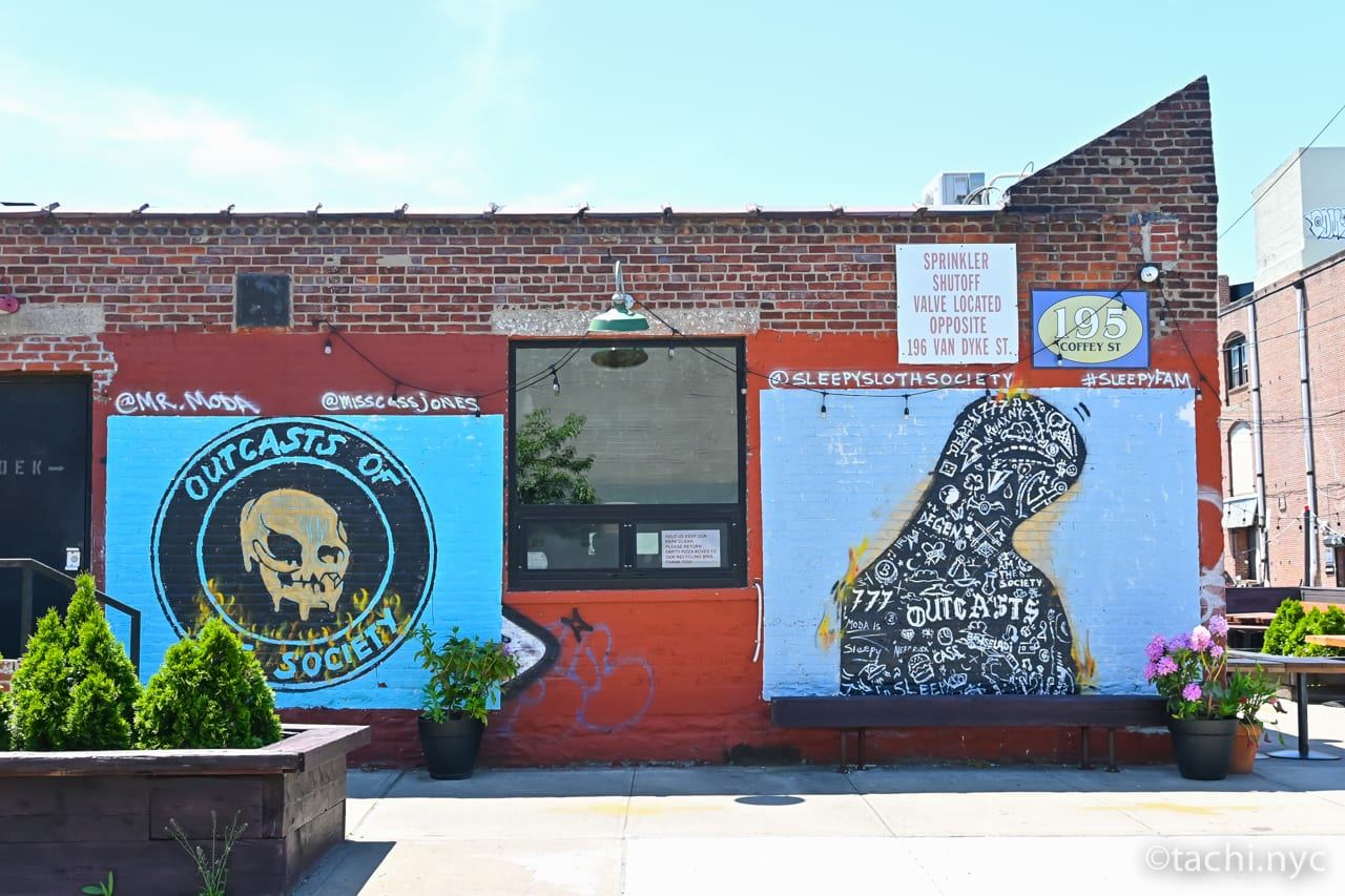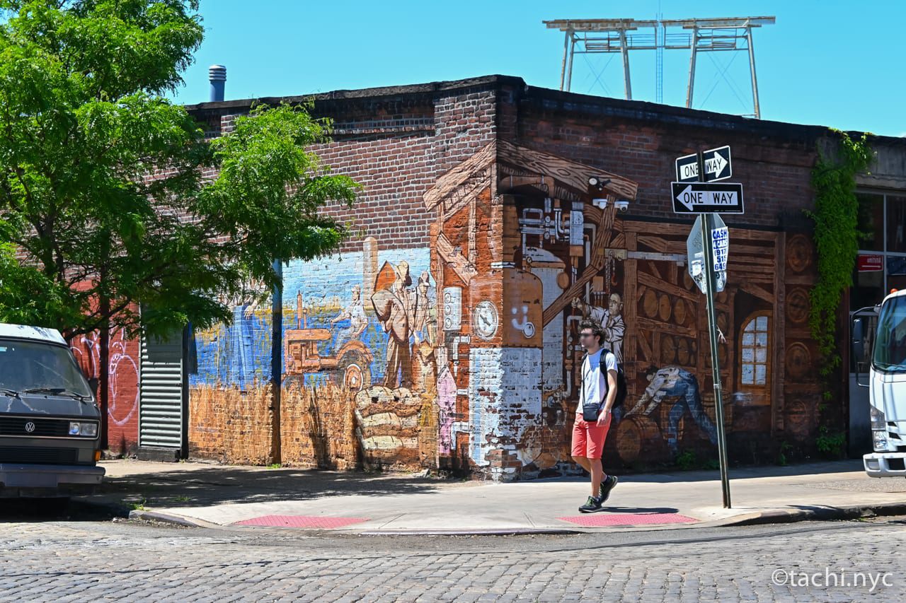レッドフックを歩くと、あちこちでグラフィティアートが見られます。赤レンガの壁とのコントラストが写真映えしますね。