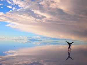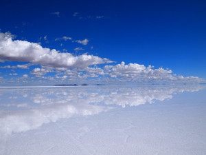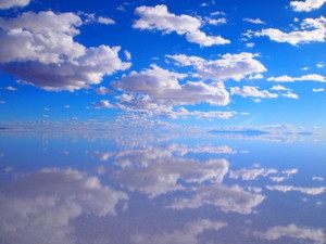 真っ青の空と、雲が塩湖に反射してまるで、空の上を歩いているような感覚です。