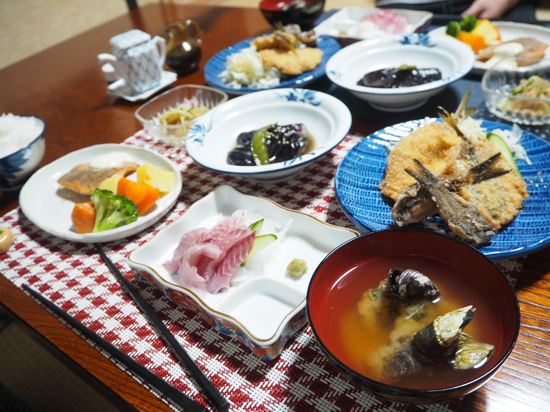 晩ごはんはオプションでつけることができ、「豪華海鮮夜飯」(3000円/税込) は、この日は魚の刺身、隠岐の名物サザエのつぼ焼き、魚のフライ、副菜など盛りだくさんでした! 「シンプル海鮮夜飯」(2000円/税込)もあるので、その日の朝昼の予定などにより選べます(※3日前までには決定して宿に連絡の必要あり。日によって内容は異なります)。