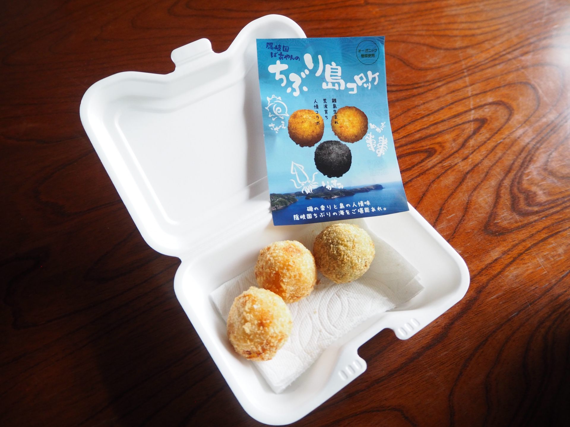 「ダイニングカフェDONA」の名物、ちぶり島コロッケ定食の「ちぶり島コロッケ」はサザエ・めかぶ・イカスミの3種類の味があります。オーガニック野菜を使った口当たりなめらかなコロッケは、テイクアウトも可能。知夫里島に来た際にはぜひ食べてほしいです。来居港から徒歩15分で着くので、少し知夫里島を散策がてら「ダイニングカフェDONA」に立ち寄るのもおすすめです。