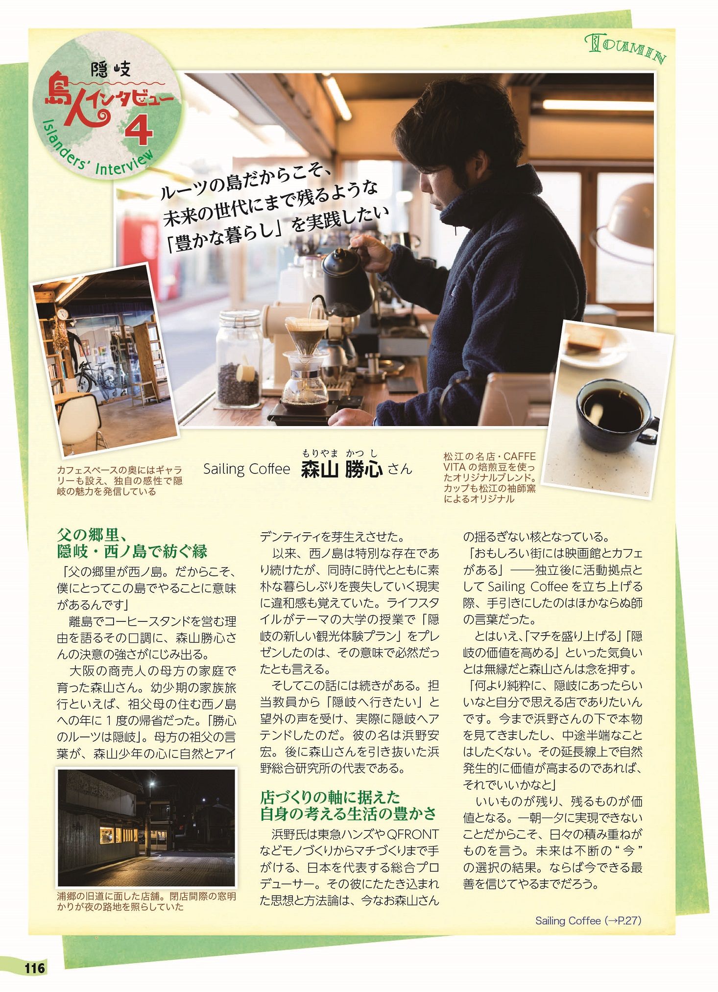 浦郷の旧道にあるカフェSailing Coffeeは、心地よい音楽が流れる店内でコーヒーを飲みながらゆったりと時間をたのしむことができます。コーヒー、カフェラテなどドリンクのほかにも、ケーキやマフィン、プリンなどもあり、テイクアウトもできるのでおすすめ。