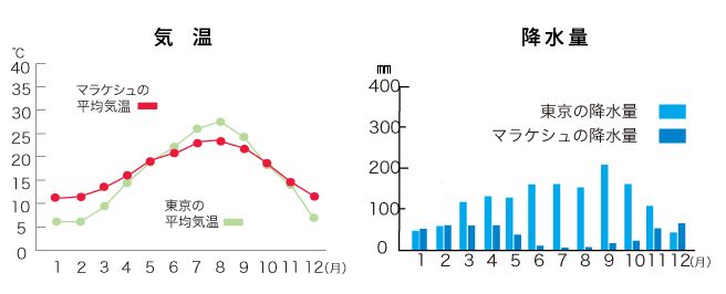 モロッコには年に2回の雨期があり、4~5月と10~11月で、降水量は少ないです。乾期は主に6~9月です。