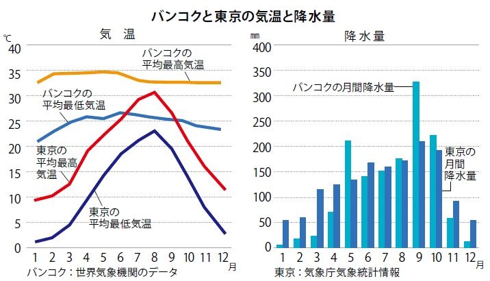 タイは熱帯に位置し、年間を通じて高温ですが、地域によって気候が異なります。季節は主に雨季、乾季、暑季(タイ気象局の分類では雨季、寒季、夏季)の3つに分けられます。