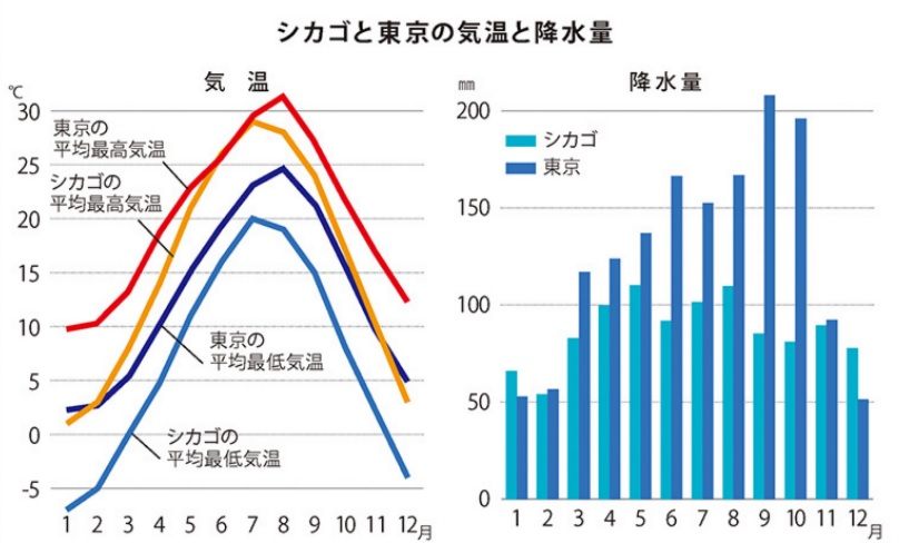 シカゴは亜寒帯湿潤気候に属し、風が強く吹くため「風の町」として知られています。年間を通して、1日の中でも天気が急変することが多く、雨が降っても数時間後には止むことがあります。